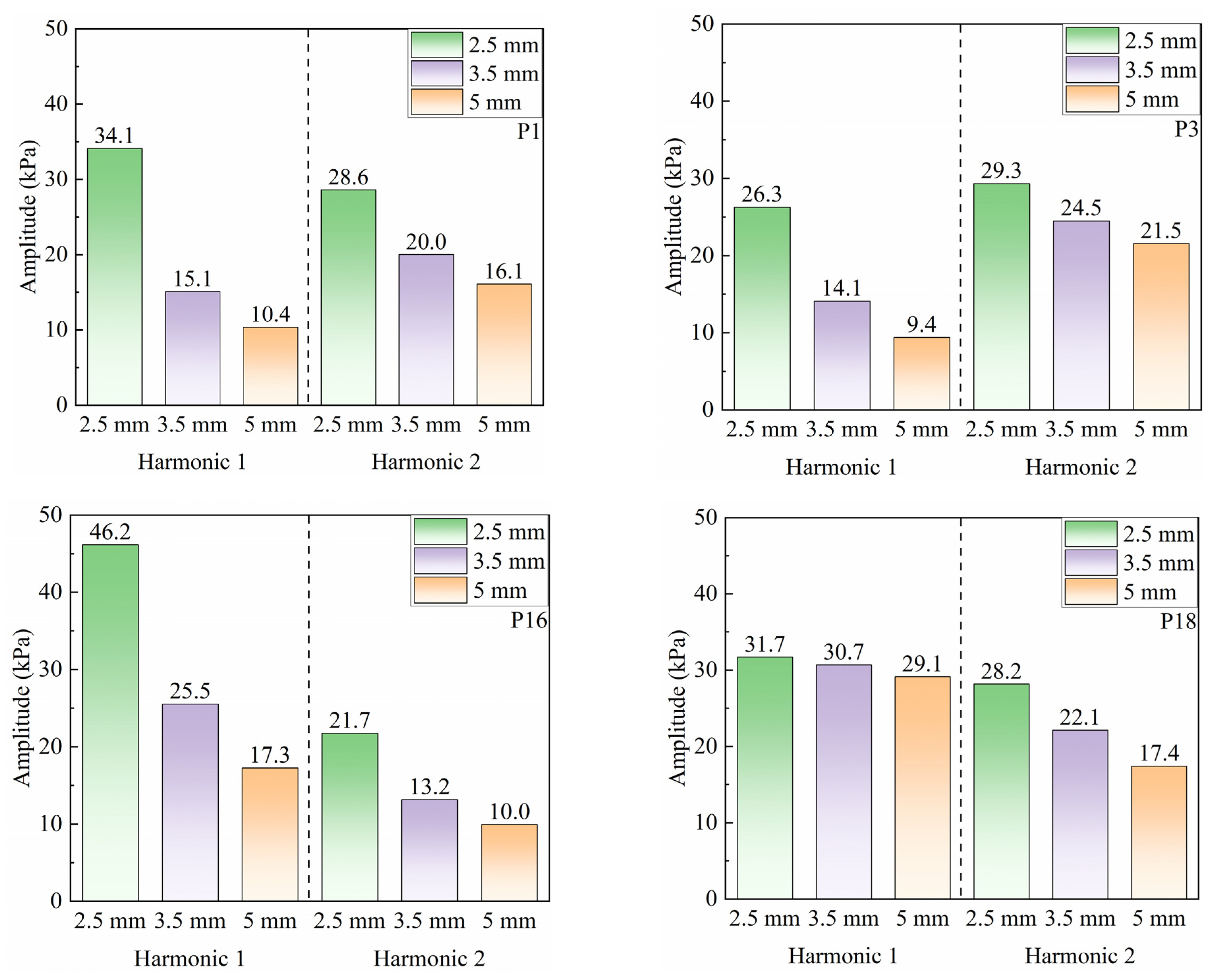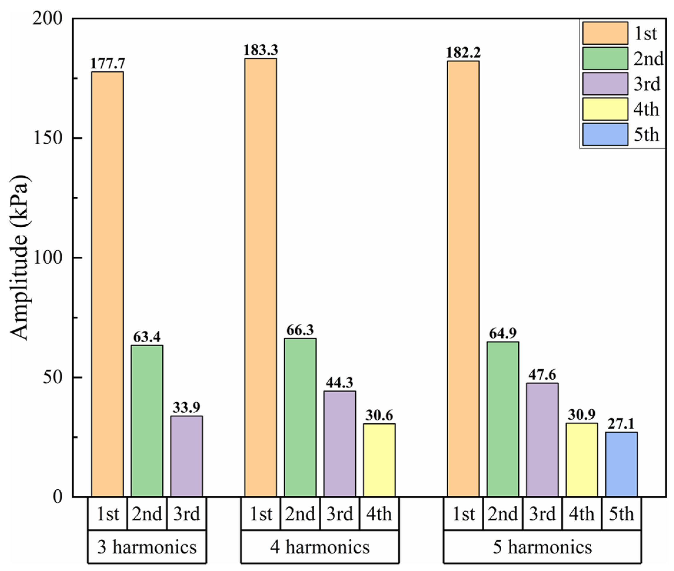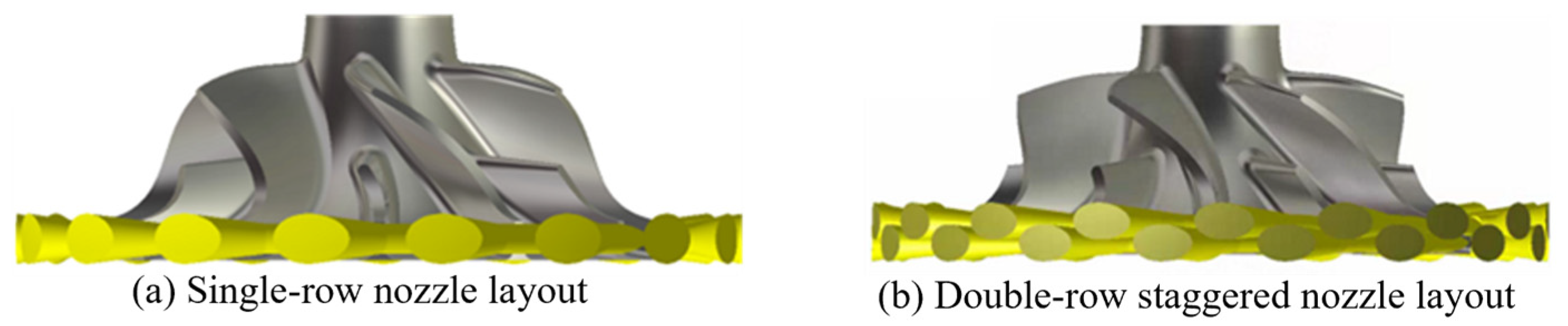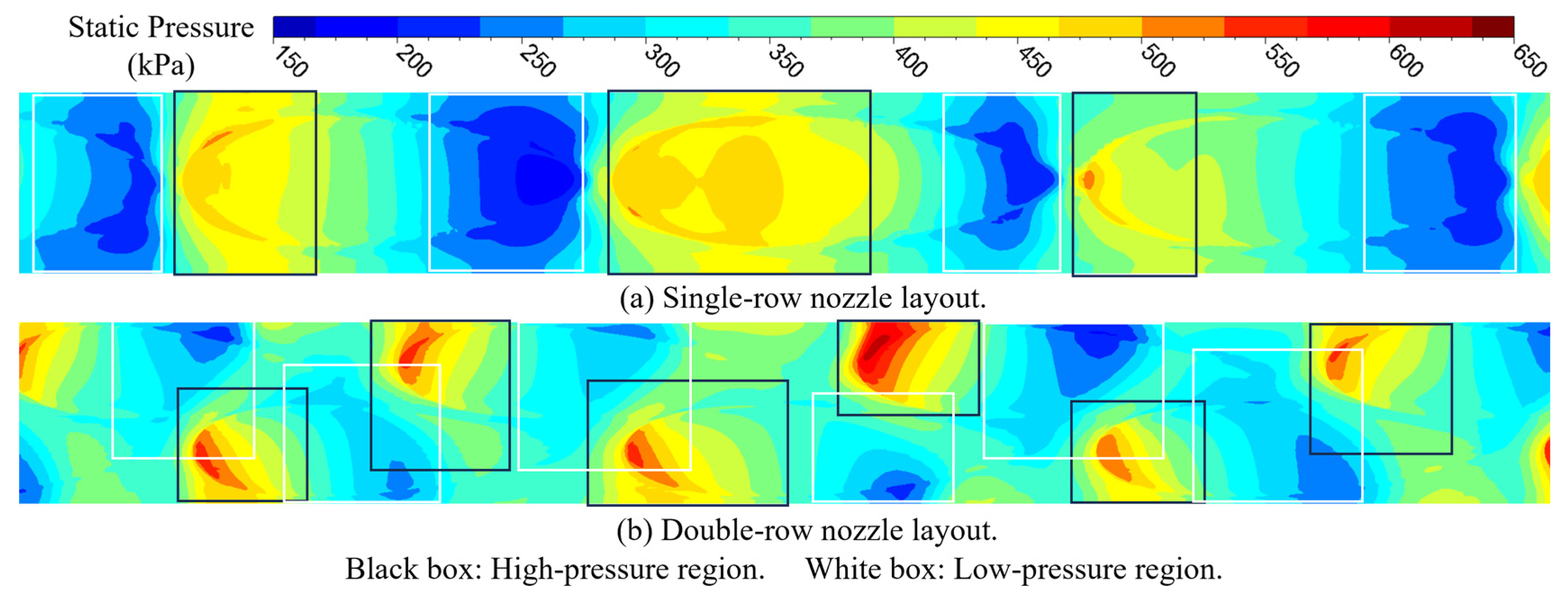 - The influence of nozzle layout on airflow excitation was investigated. It was observed that, compared with the single-row nozzle configuration, the double-row staggered nozzle layout resulted in a significant reduction in the first-order airflow excitation, with the amplitude decreased by 50%. In contrast, the excitation levels of higher order remained largely unaffected.