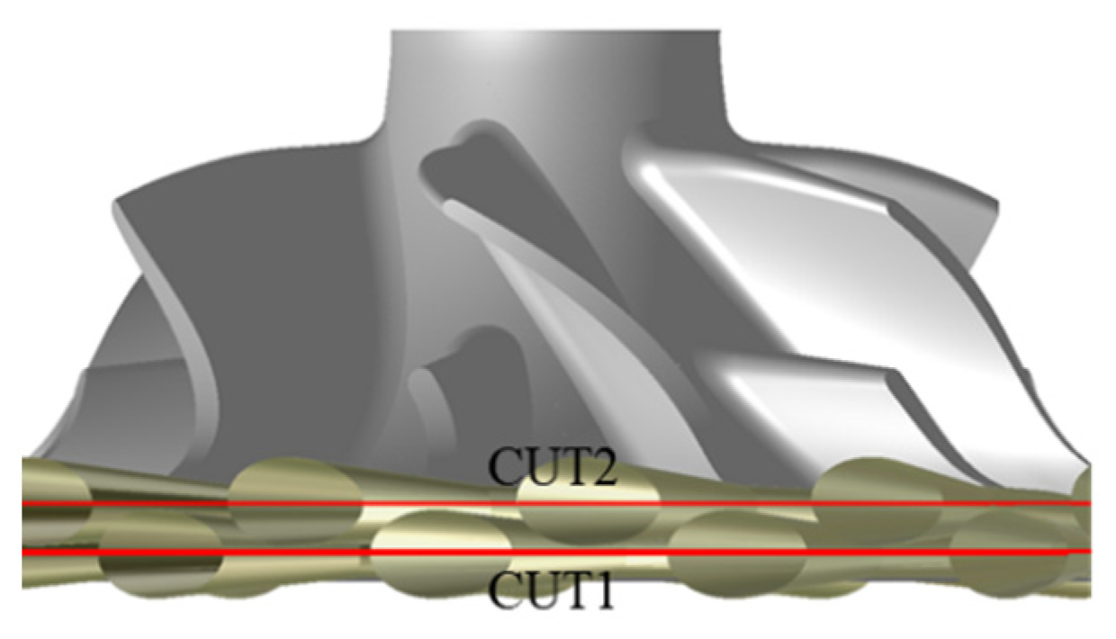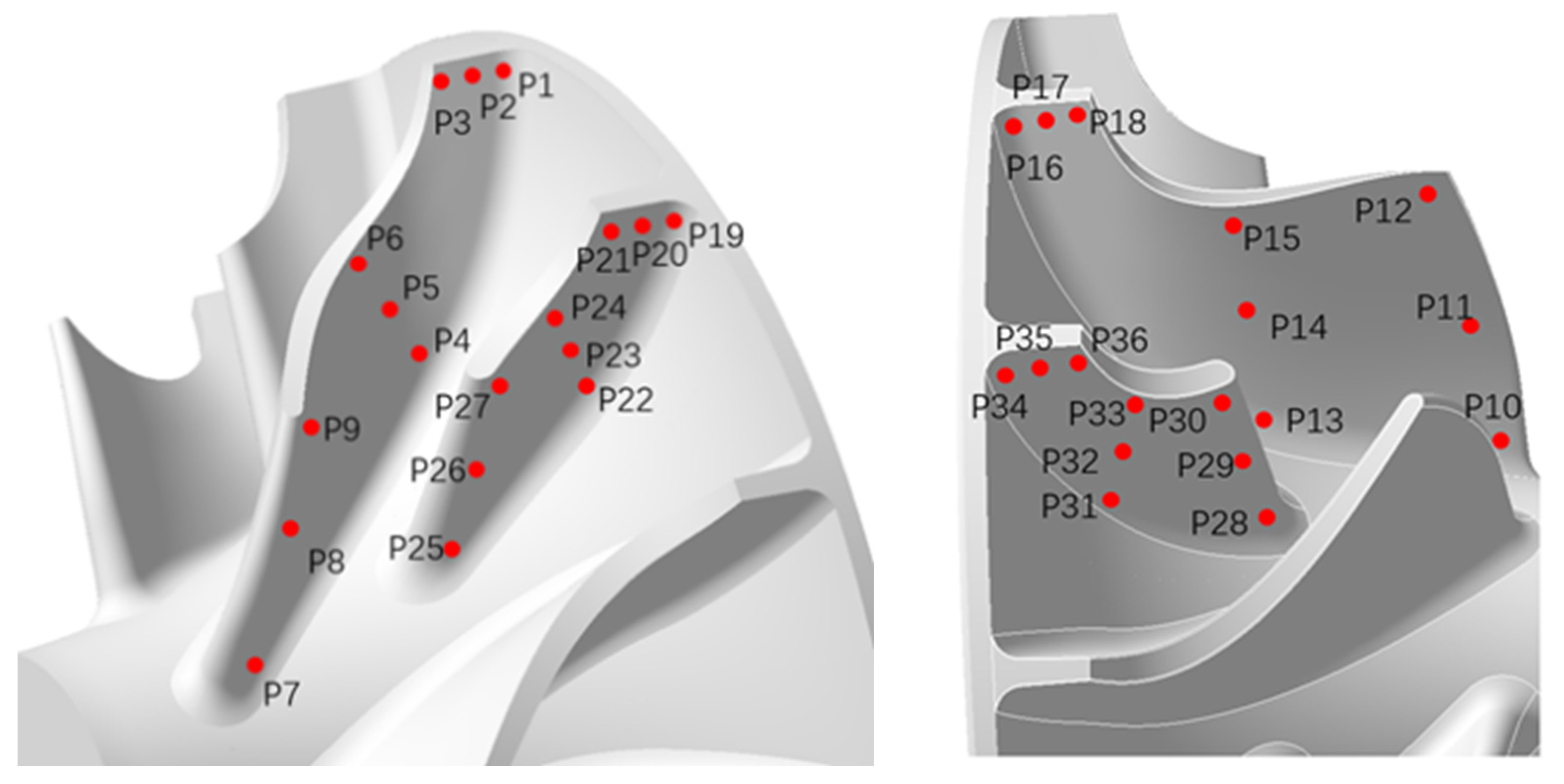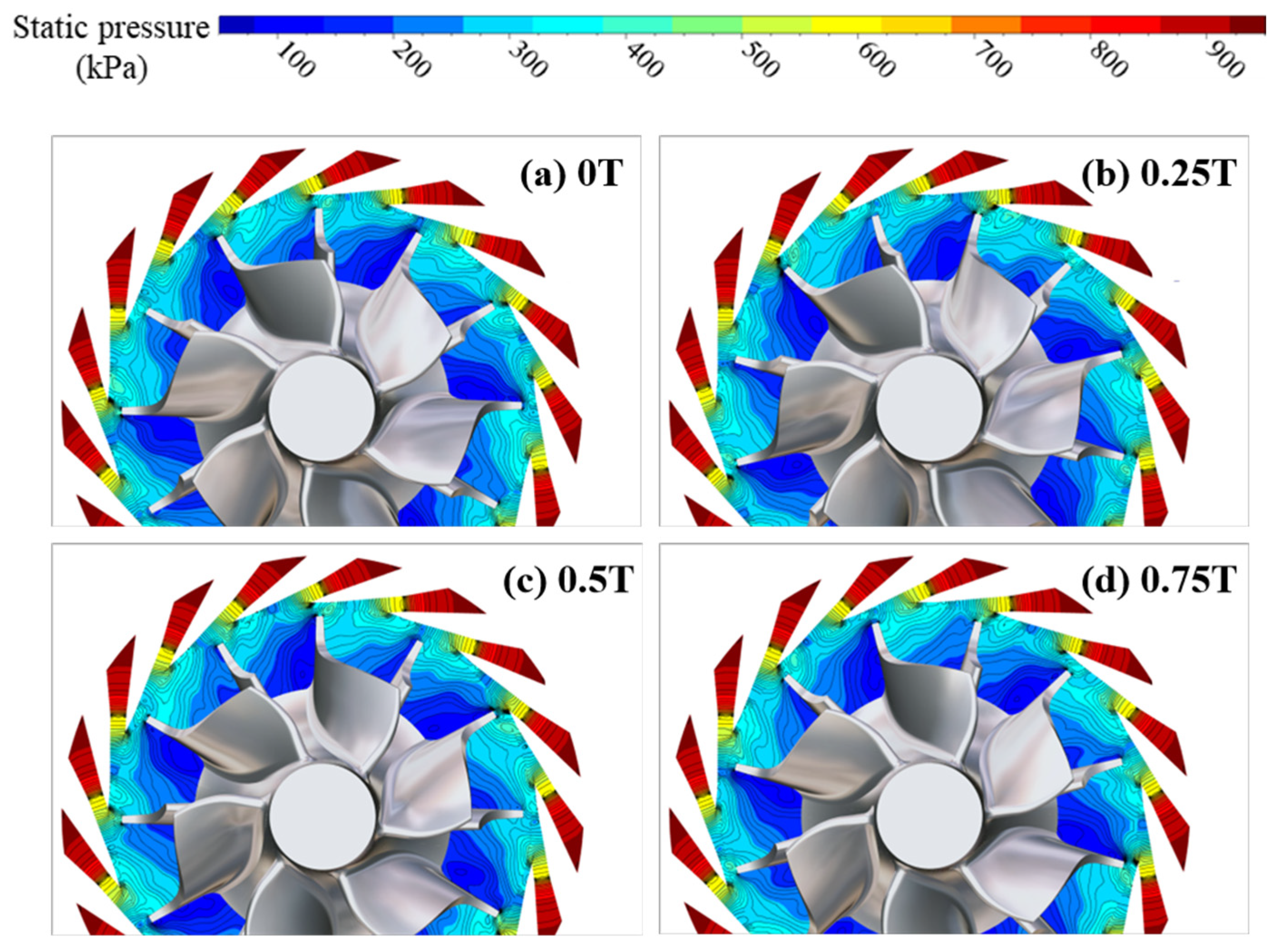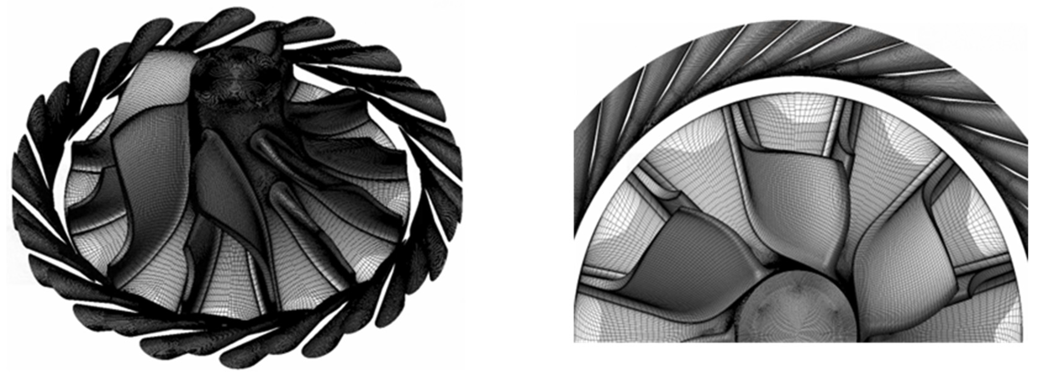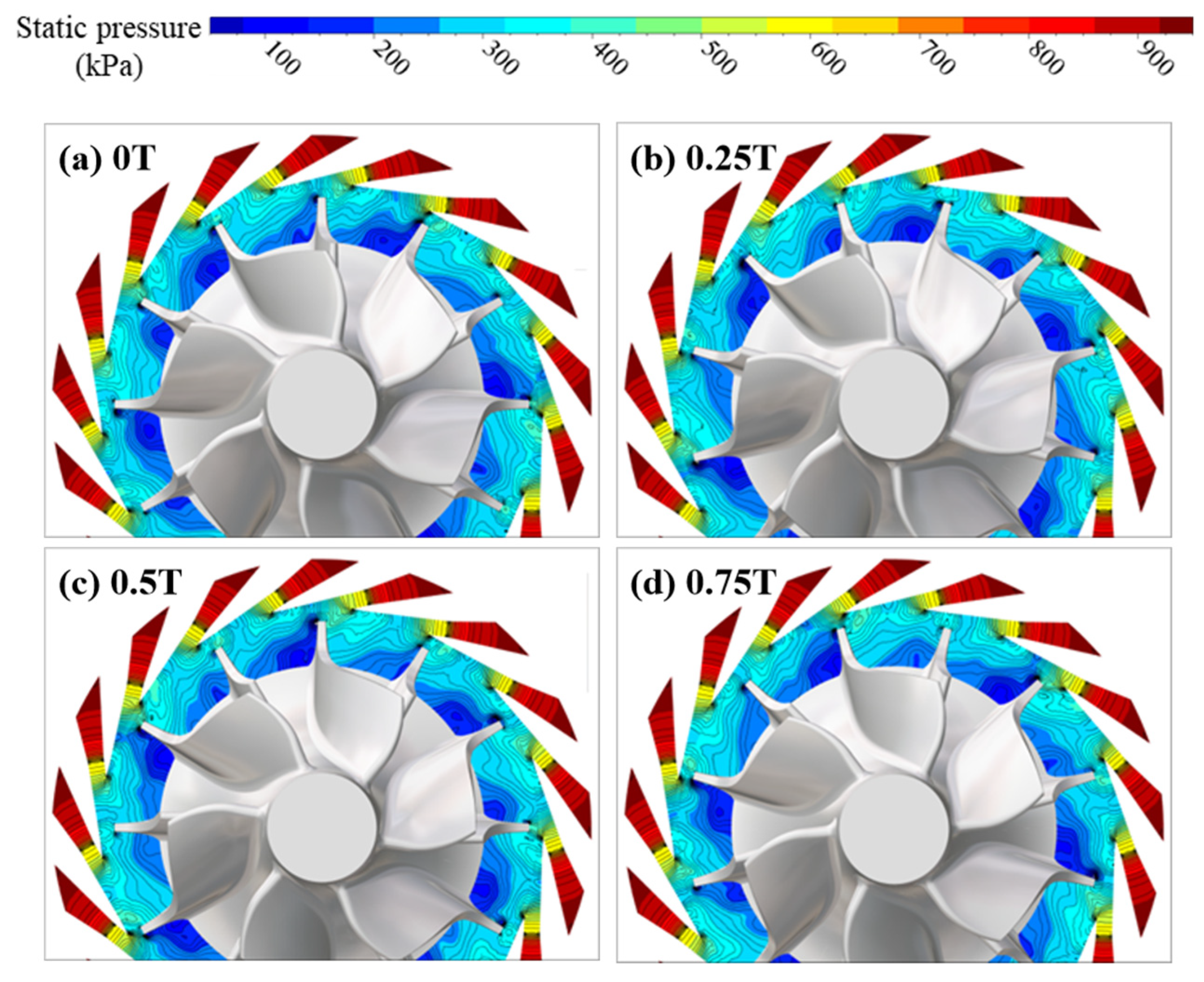 - The effects of the nozzle–impeller radial clearance on airflow excitation were examined. The findings show that increasing radial clearance is beneficial for reducing aerodynamic excitation, but this effect is nonlinear. A balance must also be considered between the reduction in airflow excitation and the accompanying decrease in turbine efficiency caused by enlarging the radial clearance.
