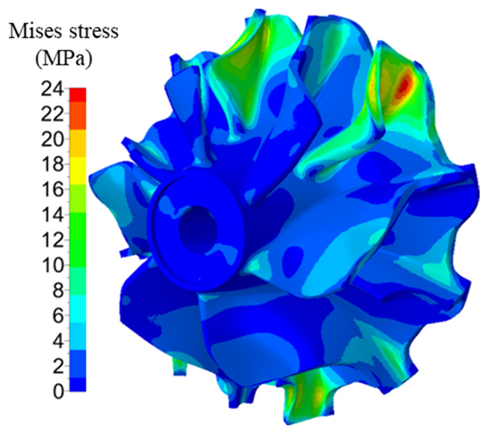 - Schwitzke, M.; Schulz, A.; Bauer, H.-J. Prediction of High-Frequency Blade Vibration Amplitudes in a Radial Inflow Turbine with Nozzle Guide Vanes. In Proceedings of the Turbo Expo: Power for Land, Sea, and Air, San Antonio, TX, USA, 3–7 June 2013; American Society of Mechanical Engineers: New York, NY, USA, 2013; Volume 55270, p. V07BT33A007. [Google Scholar] [CrossRef]