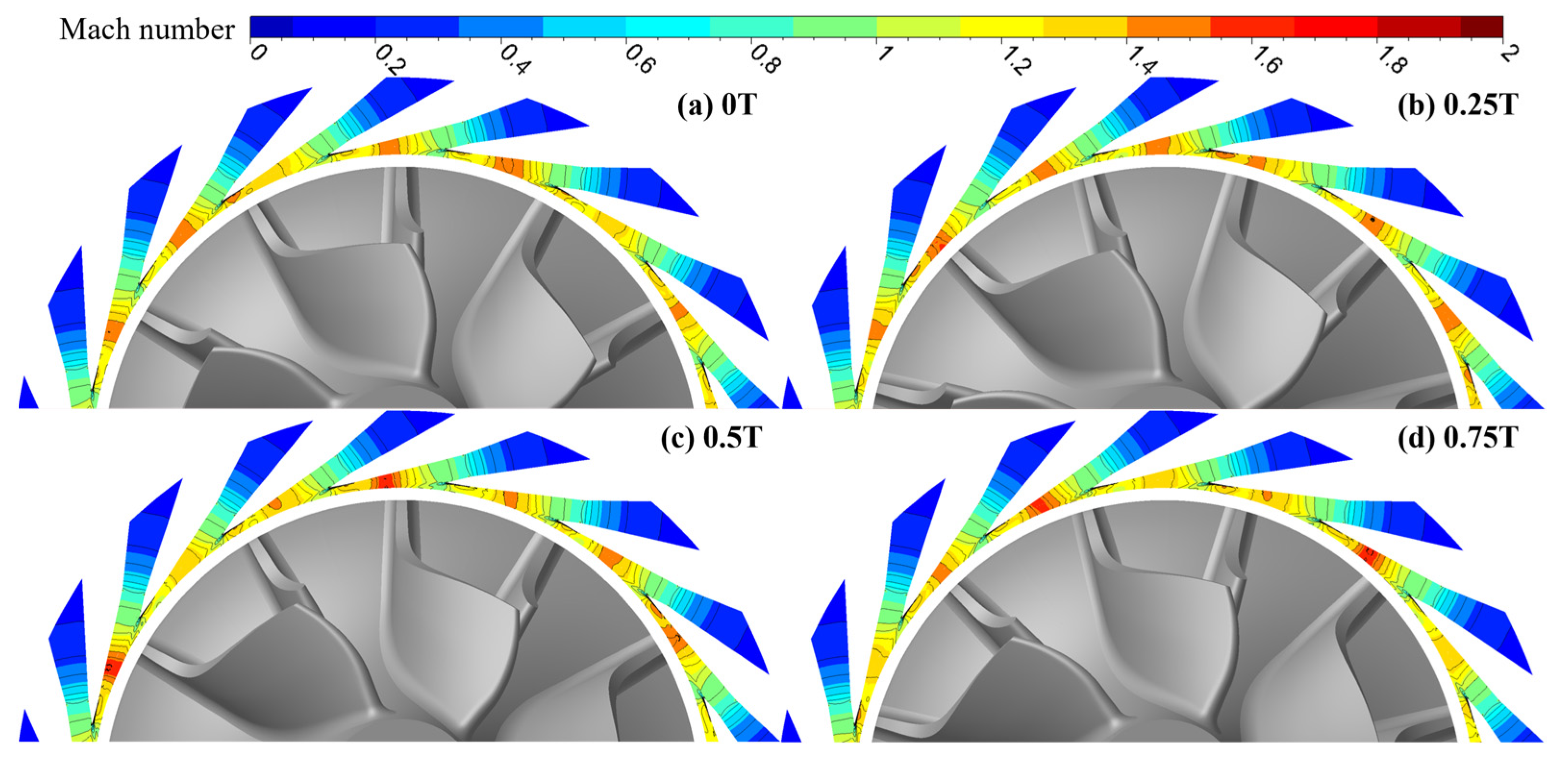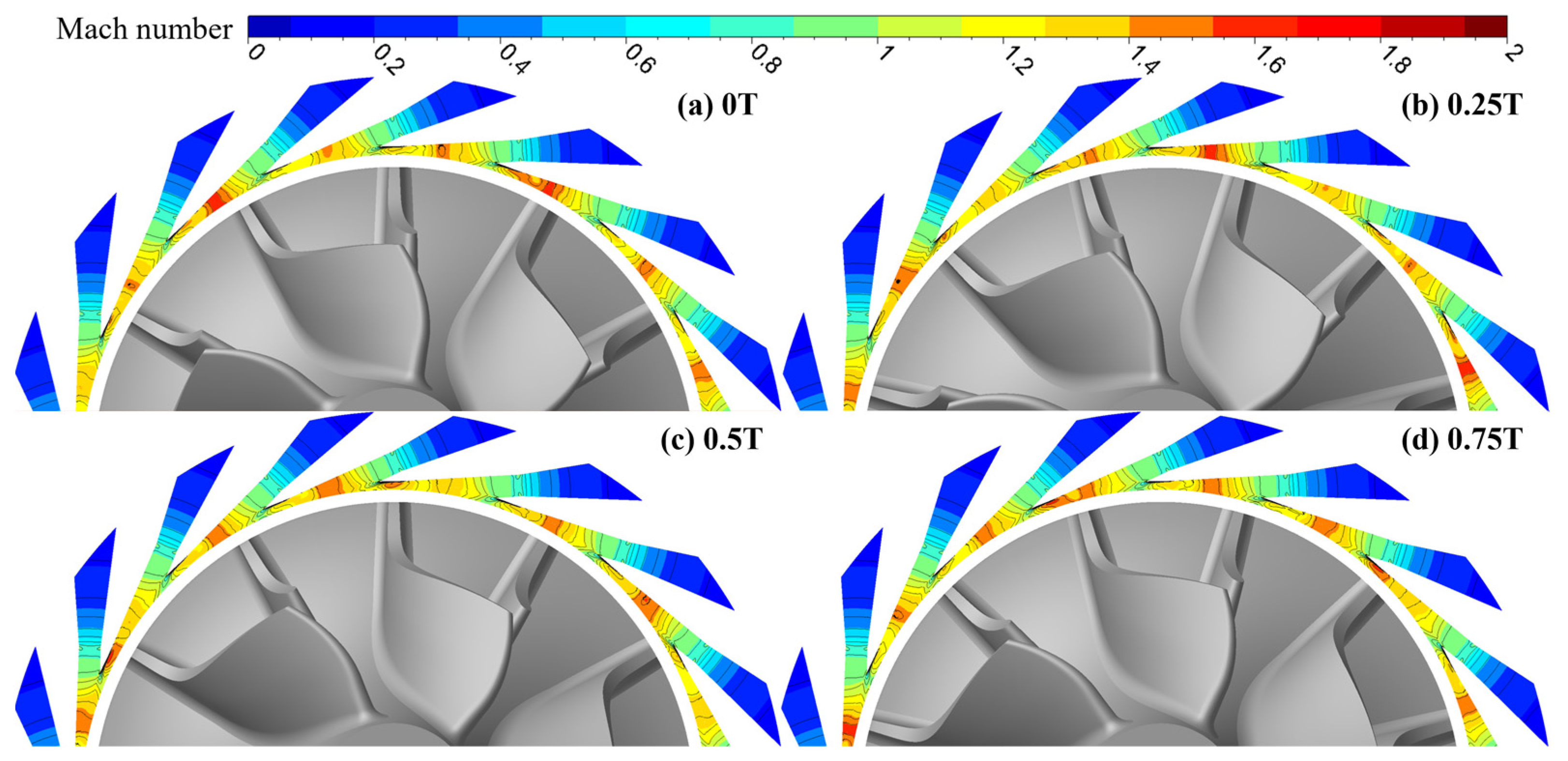 - Zhao, B.; Shi, X.; Sun, H.; Qi, M.; Song, P. Effects of Grooved Vanes on Shock Wave and Forced Response in a Turbocharger Turbine. Int. J. Engine Res. 2021, 22, 805–814. [Google Scholar] [CrossRef]
