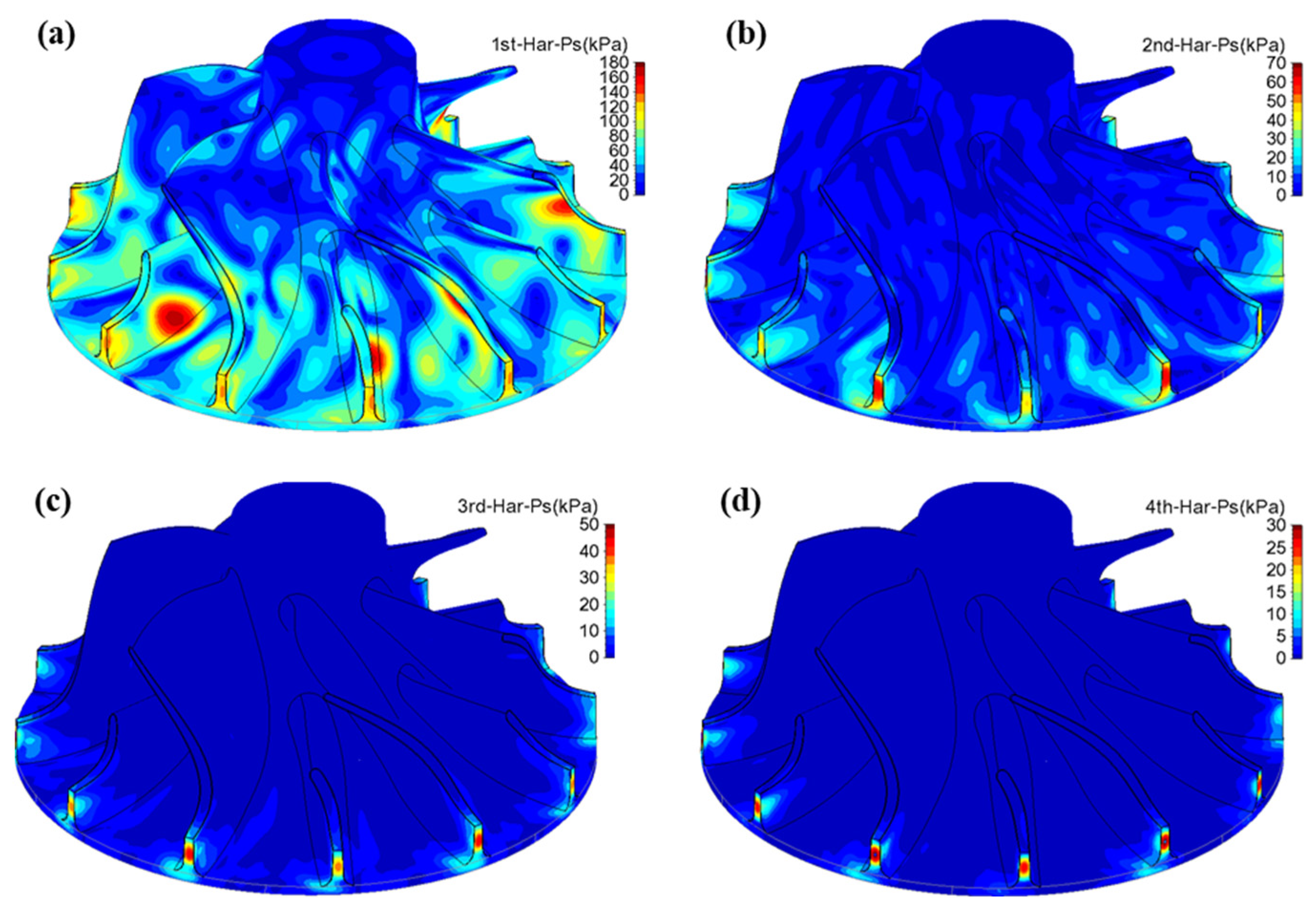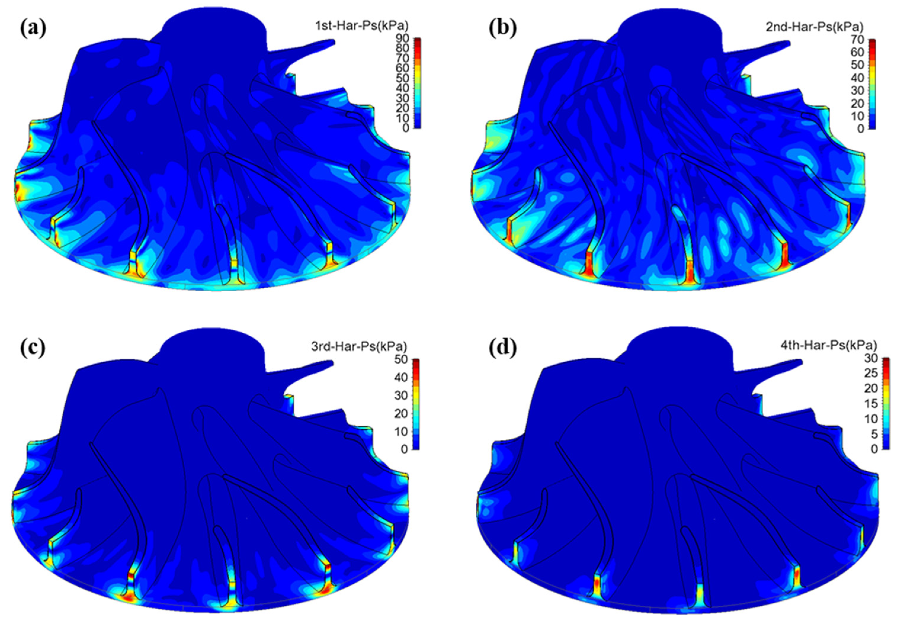 - The nozzle layout had a significant impact on the airflow excitation of the turbine impeller. Compared with the single-row nozzle layout, the airflow excitation was significantly weakened in the double-row staggered nozzle layout. The single-row nozzle layout exhibited pronounced first-order airflow excitation characteristics. The maximum amplitude was 180 kPa, with the high-amplitude regions distributed throughout the entire impeller flow passage. For the double-row staggered nozzle layout, the maximum amplitude of the first-order airflow excitation was only 50% of that observed in the single-row nozzle layout. The high-amplitude regions were confined to the impeller leading-edge area. The amplitudes and distributions of airflow excitations of the other orders showed little difference.