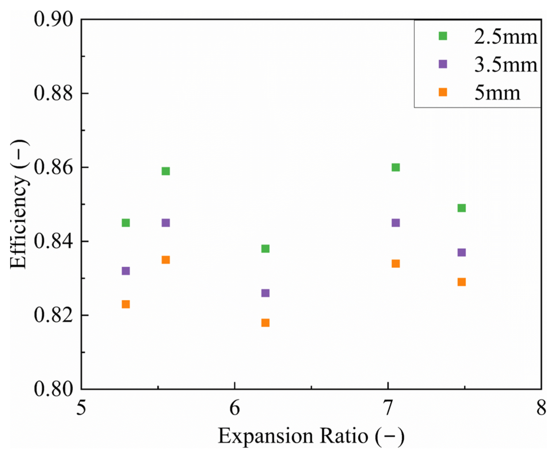 - Increasing the radial clearance between the nozzle and the impeller effectively reduced airflow excitation and enhance impeller safety. However, the effect of increasing the radial clearance on weakening airflow excitation was nonlinear. With increasing radial clearance, the reduction in airflow excitation became less effective. When the radial clearance increased from 2.5 mm to 3.5 mm (a 40% increase), the maximum reduction in first-order airflow excitation reached 55.7%. Increasing the radial clearance further from 3.5 mm to 5 mm (a 42.9% increase) resulted in a maximum reduction of 33.3% in first-order airflow excitation. Moreover, increasing the radial clearance led to a reduction in turbine efficiency. The corresponding reductions in efficiency were 1.2% and 0.8%, respectively. Therefore, when weakening airflow excitation by increasing the radial clearance, it is necessary not only to consider turbine size limitations but also to balance turbine efficiency and airflow excitation.