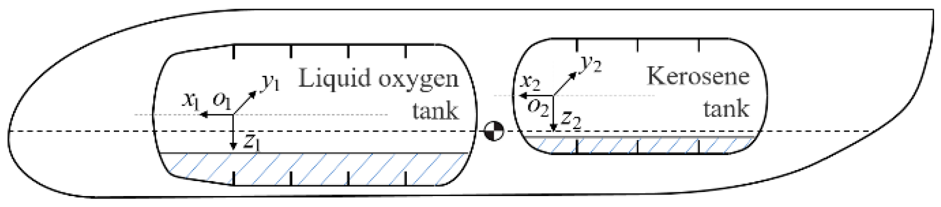 42], which are easily included into the dynamics and control equations, facilitating frequency domain stability analysis and flight control design improvement. This paper is dedicated to identifying the root cause of rigid–liquid control coupling oscillations and providing active suppression solutions. The innovative contributions include: