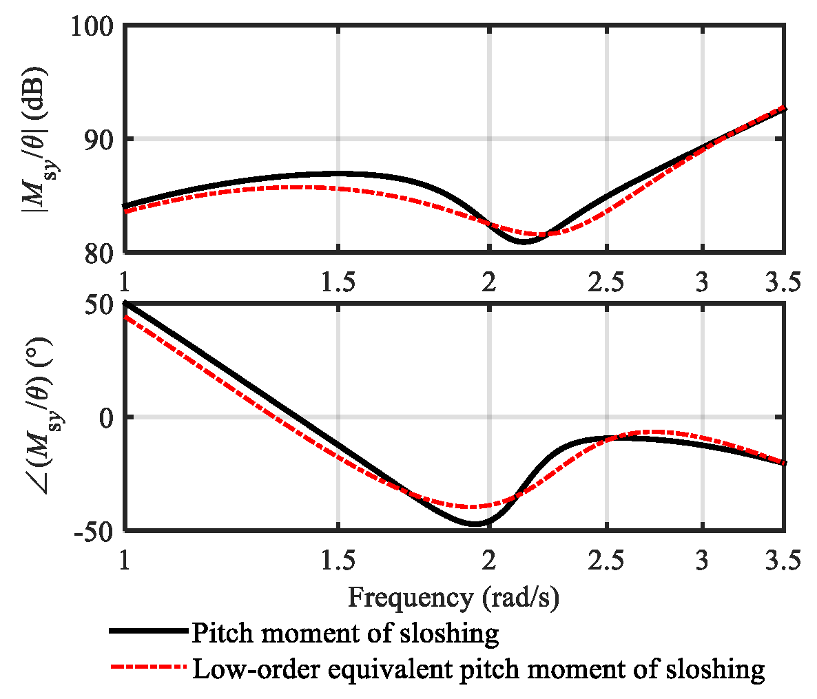 With the flight oscillation period of about 2.8 s, the low-order compensation model tolerates a phase prediction deviation of about ±90°, while providing effective oscillation suppression. For a sloshing transfer function, accurately capturing the phase frequency characteristics is more crucial for damping effect analysis, and a compensation model can be quickly built by obtaining the frequency characteristics around the phase-changing regions (amplitude peaks or valleys).