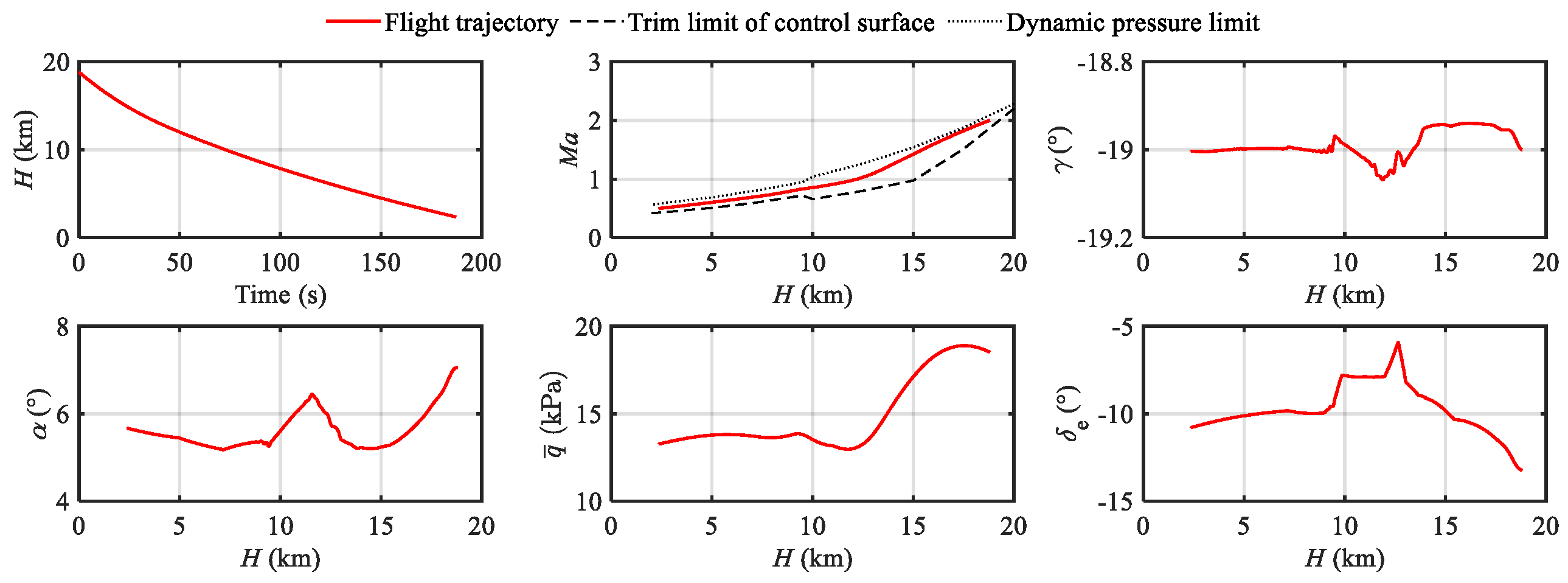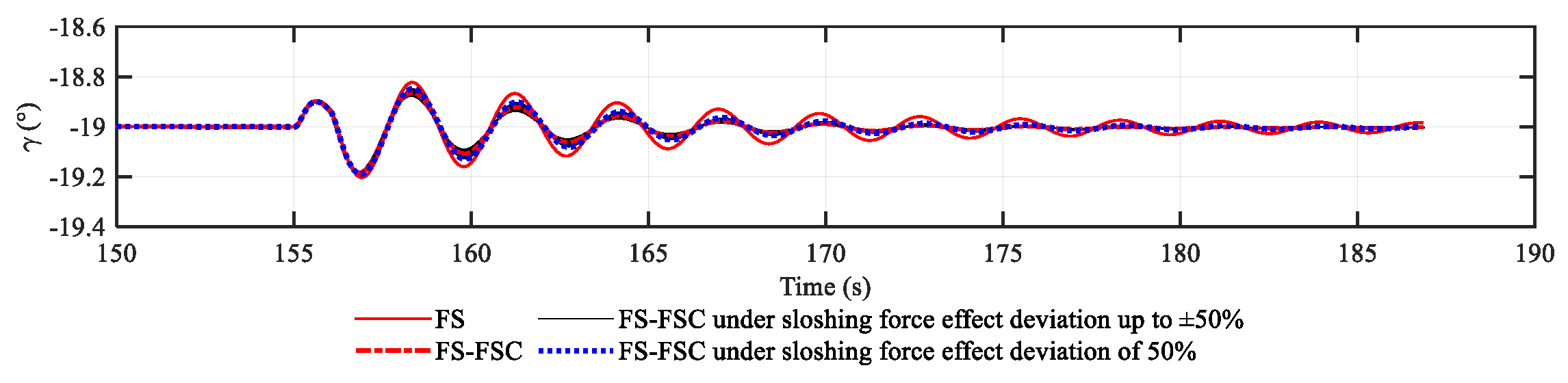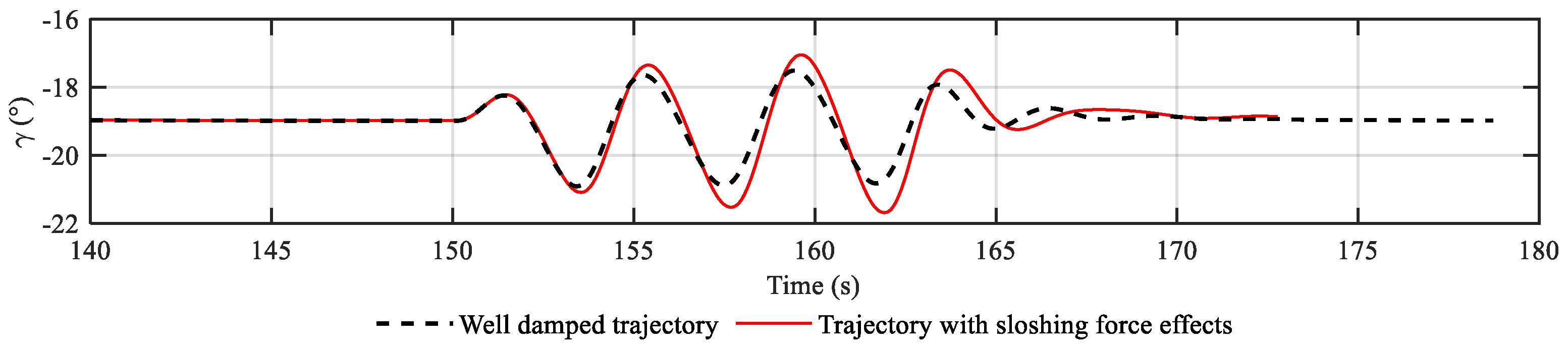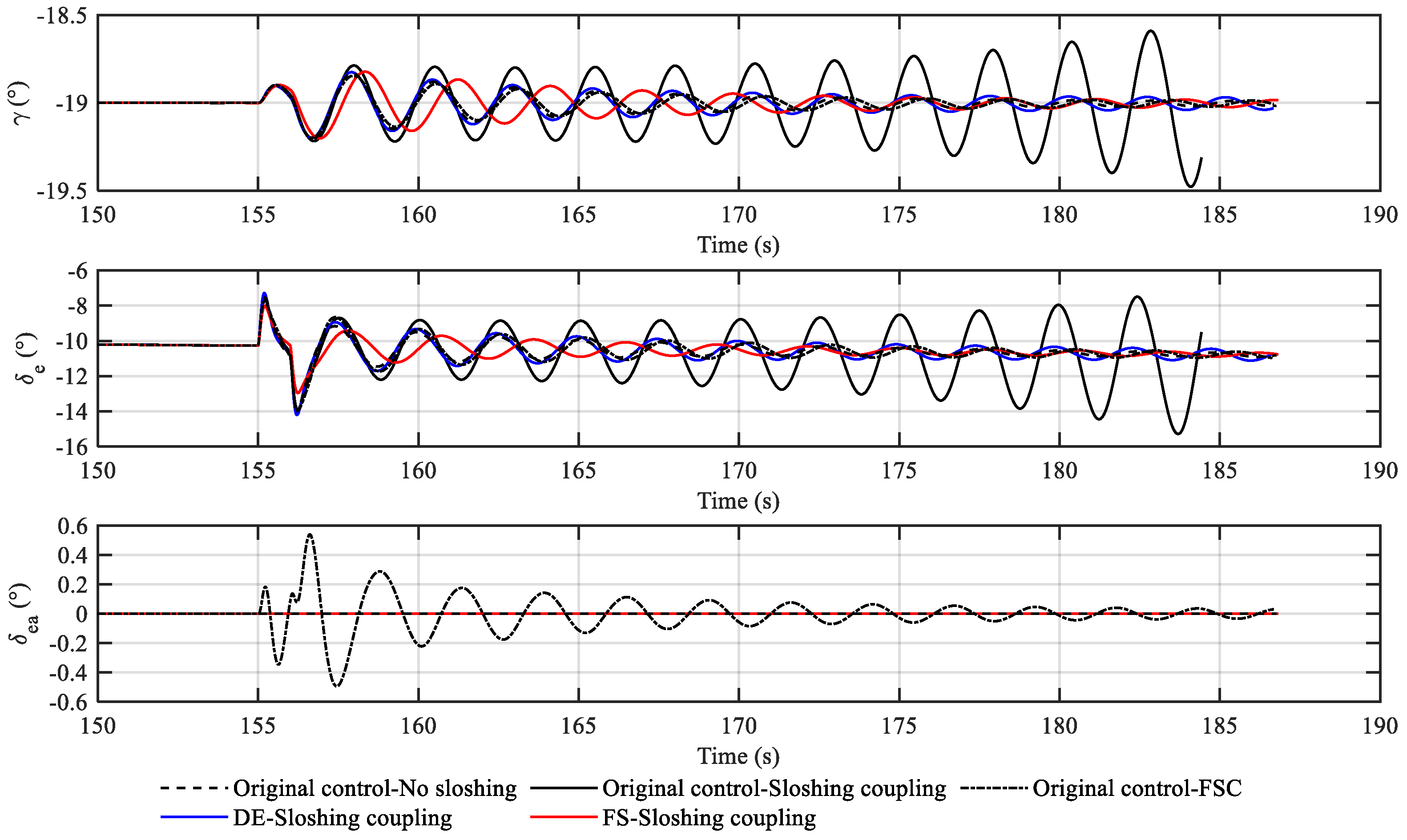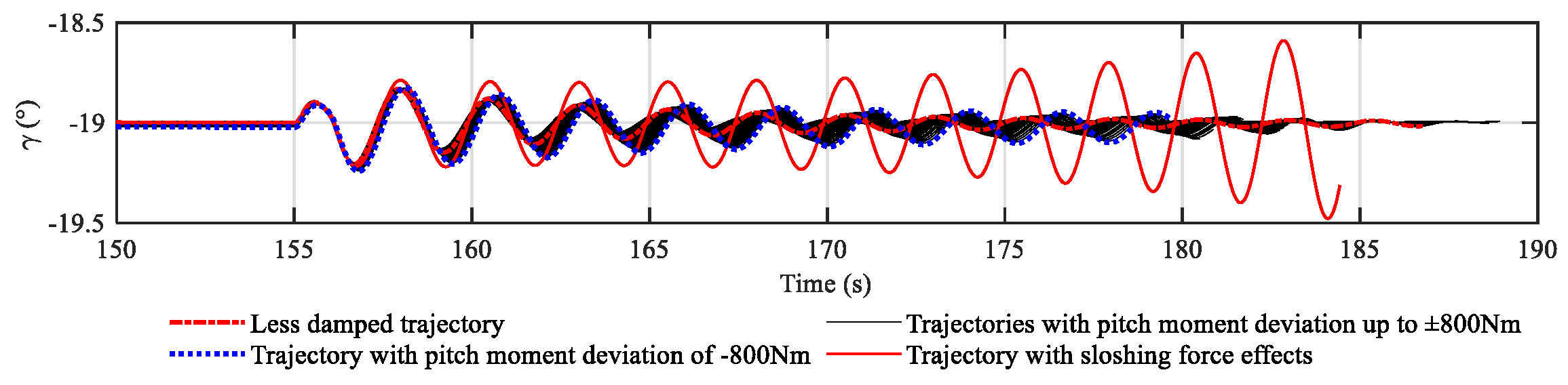 Figure 15 shows the path angle and the deflection of control surfaces along the trajectory of different control scenarios. After the disturbance at 155~156 s, flight trajectories oscillate at the frequency of dominant modes (ranges from 2.1 to 2.6 rad/s). In the trajectory of the original control under the sloshing effect, an obvious divergence starts around 165 s at