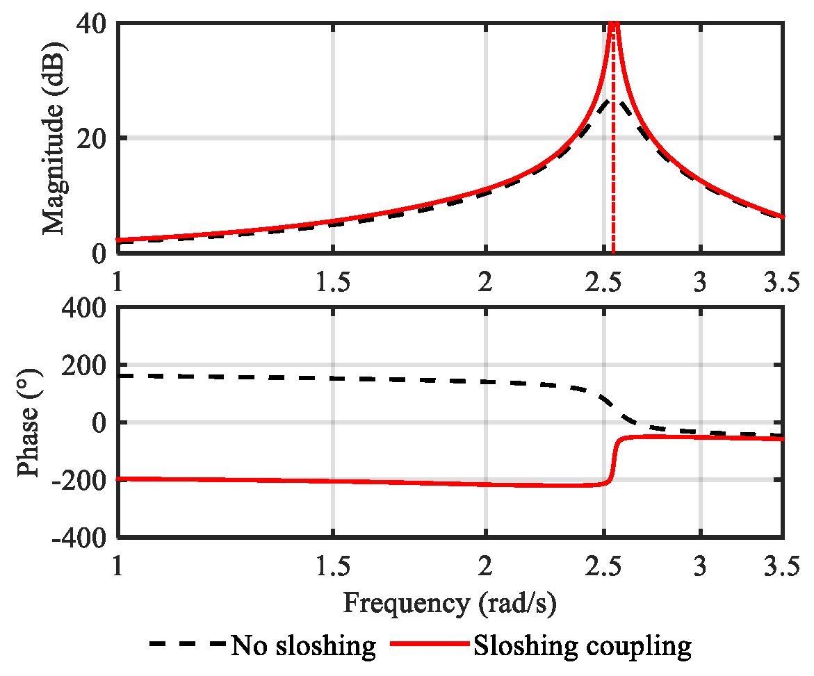 Section 4.1, the deteriorated flight stability was improved by adjusting the control gains in Equation (8) to Equation (10). However, increasing the damping gain may not fully counteract the negative damping of sloshing, or may introduce overly conservative designs that compromise the tracking performance. Likewise, adjusting the tracking gain may also degrade the tracking capability. It may conflict with the higher control performance requirements by simply adjusting the control gains for sloshing suppression.