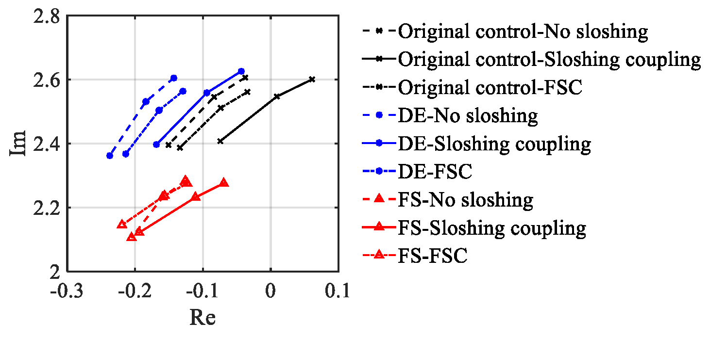 The DE enhances the damping of the dominant mode by adjusting control gains and . Compared with the original scheme, DE achieves a higher damping ratio in the no-sloshing condition, while the frequency ranges of both are close. Under the sloshing coupling, the damping ratios of the two schemes decrease synchronously, with the system becoming unstable first in the original scheme control. Thus, DE achieves a better resistance to sloshing at a higher damping ratio, though overall the sloshing effects on both schemes are not significantly different.
