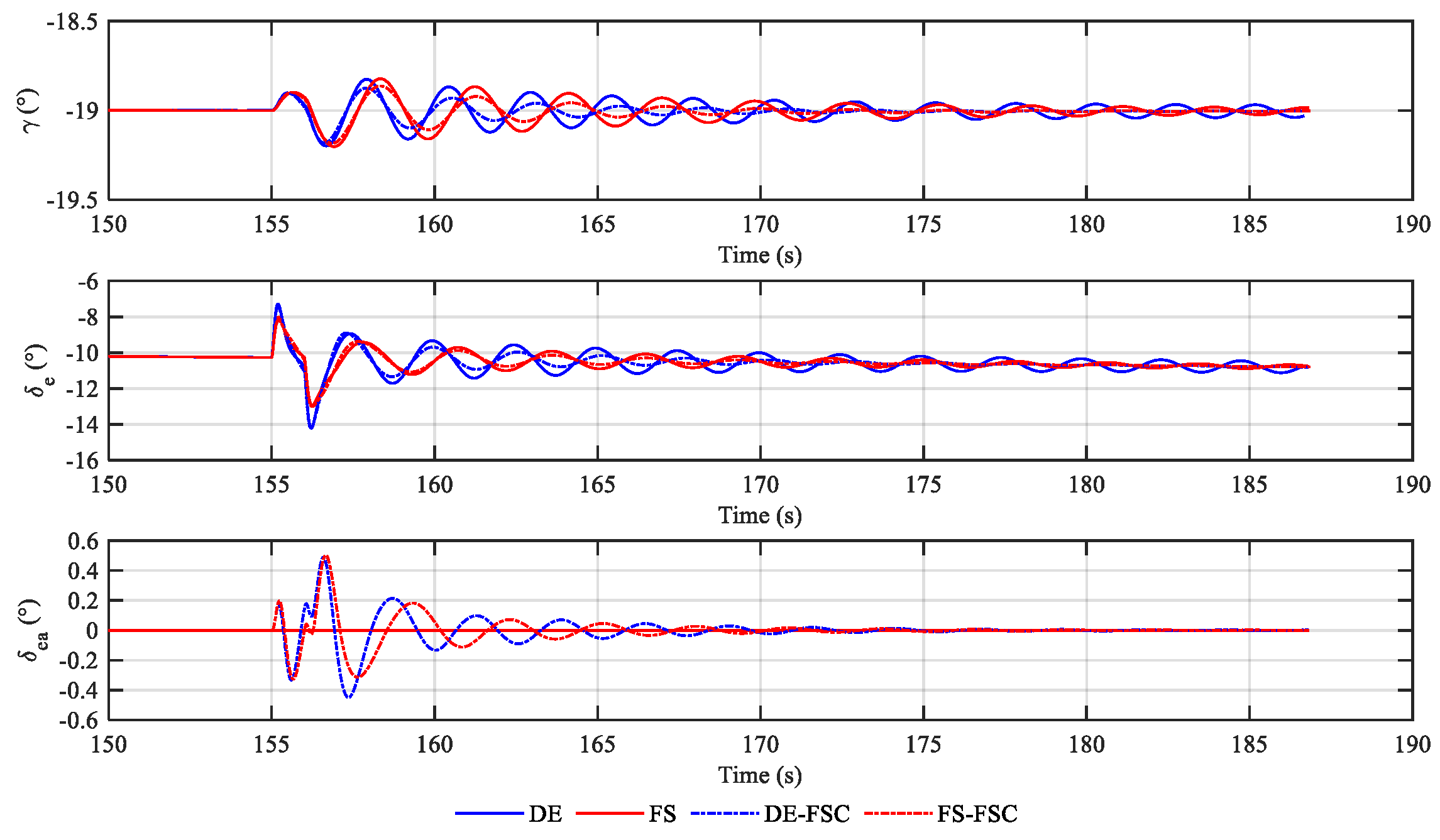. In comparison, both DE-FSC and FS-FSC control reach a similar fastest oscillation attenuation, while FS-FSC results in a smaller elevator deflection because of the lower tracking gains in this case. In conclusion, different suppression schemes improve flight stability respectively, and the combined control scheme of enhancing damping at an appropriate frequency with compensation has the best control performance, with its fastest oscillation attenuation and acceptable control cost.