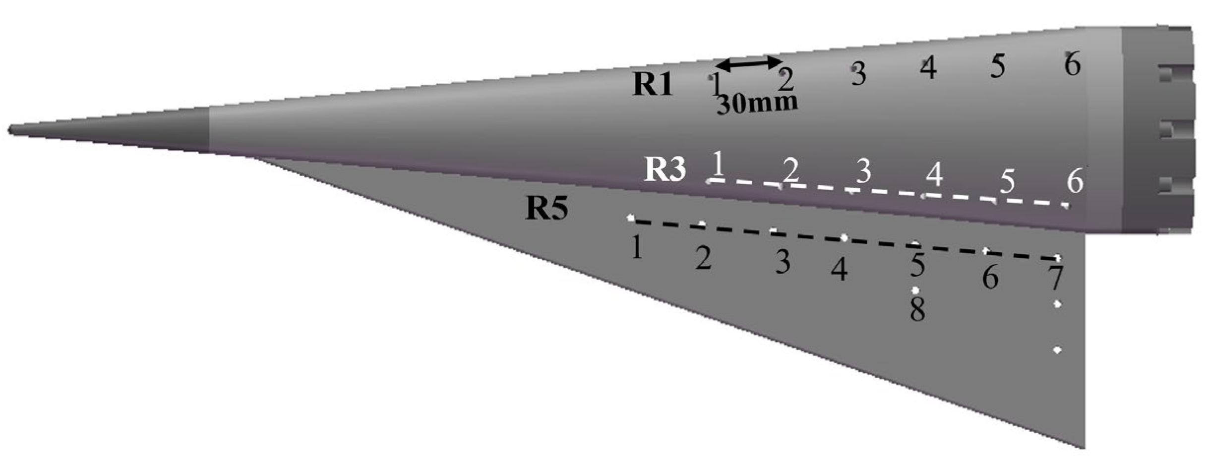 - Turbeville, F.D.; Schneider, S.P. Effect of Nose Bluntness on Fin-Cone Transition at Mach 6. In Proceedings of the AIAA AVIATION 2021 Forum, Virtual Event, 2 August 2021; American Institute of Aeronautics and Astronautics: Reston, VA, USA, 2021. [Google Scholar]