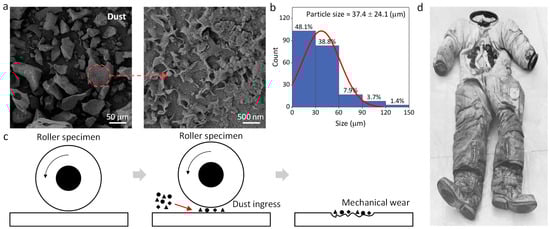 Lunar dust hazards. (a) SEM characterization of lunar dust and (b) particle size distribution [60]; Copyright 2026, Elsevier. (c) Mechanical wear schematic [61]; Copyright 2024, Elsevier. (d) Lunar dust-covered spacesuit [62]; Copyright 2017, Elsevier.