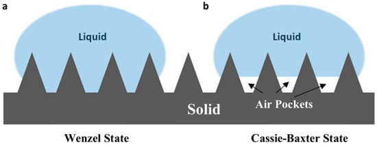 The wetting behavior of droplets can be described using the Wenzel model and the Cassie–Baxter model. The Wenzel model effectively describes the wetting behavior of droplets when they fully wet a rough surface (Figure 6a) [79]. However, in certain cases, as shown in Figure 6b, the droplet cannot enter the microscopic grooves of the rough structure and instead partially suspends at the composite interface formed by the surface microstructure and gas. To characterize this non-fully wetted state, the Cassie–Baxter model was proposed to describe the wetting behavior of droplets at the solid–gas composite interface [80].