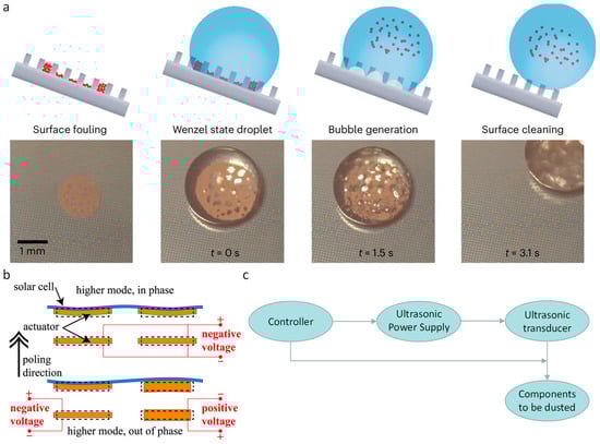 The most prevalent mechanical dust removal technique currently under development is ultrasonic dust removal. For instance, the technique of piezoelectric actuators generating vibrations to remove dust from the surface of a solar cell, as demonstrated in Figure 7b, is based on the complementary nature of the piezoelectric effect and vibration modes [34]. A piezoelectric actuator is capable of generating vibrations by converting electrical energy into mechanical energy through the inverse piezoelectric effect. Applying an AC voltage to the piezoelectric actuator results in the actuator generating high-frequency vibrations, which are subsequently transmitted to the entire solar cell structure via the inactive surfaces affixed to the solar cell. It has been demonstrated that different vibration modes can be realized by varying the phase and frequency of the drive signal. The same-phase vibration mode has been shown to subject dust particles on the surface of the solar cell to a uniform vibration effect, while the anti-phase vibration mode has been demonstrated to form an alternating vibration field on the surface of the solar cell, which has been shown to enhance the loosening and dislodging of dust particles. It is evident that the judicious configuration of the actuator and the driving signal is instrumental in achieving the effective removal of dust from the solar cell surface.