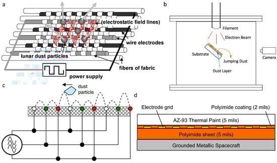 Electrostatic dust removal techniques. (a) Electrostatic cleaning system for removing lunar dust adhering to spacesuit fabrics [32]; Copyright 2011, American Society of Civil Engineers. (b) Schematic of experimental setup for electron beam surface dust removal [47]; Copyright 2020, Elsevier. (c) Three-phase electrode configuration of an electrodynamic dust shield [30]; Copyright 2009, Elsevier. (d) Schematic of the surface cross section of an electrodynamic dust shield embedded in a substrate coated with AZ-93 thermocoating (the unit “mils” is approximately 0.0254 mm) [20]. Copyright 2011, Elsevier.