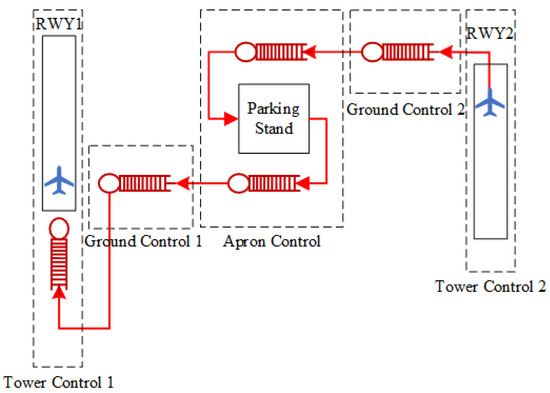 Based on the two-dimensional classification method of control positions and taxi directions, the apron system is decomposed into multiple mutually coupled queues, as shown in Figure 2. The physical meaning and service objects of each queue are defined as follows: