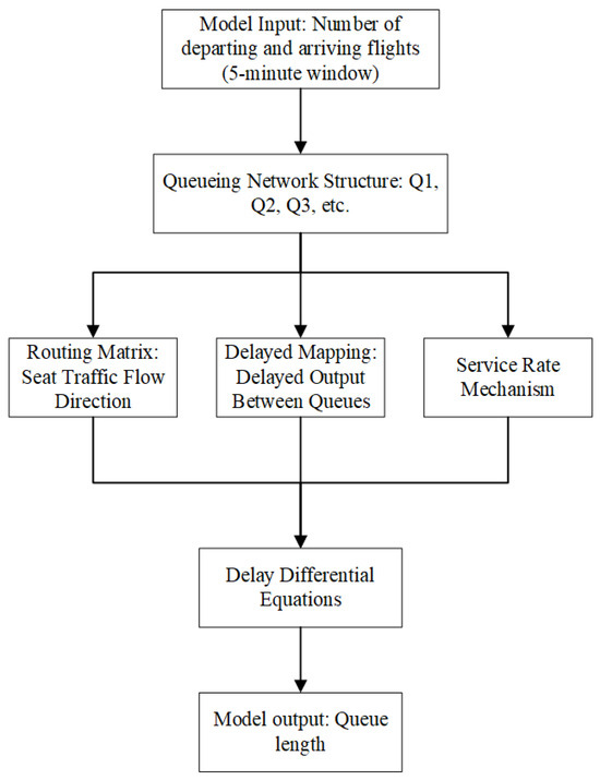 The remainder of this paper is structured as follows: Section 2 presents a comprehensive literature review. Section 2.1 and Section 2.2 systematically summarize the mathematical and simulation methods for airport surface operation dynamics, respectively; Section 2.3 identifies limitations of existing approaches and clarifies the research gaps addressed. Section 3 focuses on methodology development: Section 3.1 and Section 3.2 define model assumptions, boundary conditions, queue classification rules, and apron traffic characteristics as the foundational framework; Section 3.3, Section 3.4 and Section 3.5 elaborate on the model’s mathematical formulation, parameter calibration strategies (incorporating delay coupling effects), and specific solution process; Section 3.6 concisely summarizes the model architecture. Section 4 conducts an empirical case study on Beijing Daxing International Airport: Section 4.1, Section 4.2, Section 4.3 and Section 4.4 detail the airport’s ground topology, routing matrix, queue delay, service rate, and actual traffic distribution as core data support; Section 4.5 and Section 4.6 analyze the model’s predictive performance and discuss prediction error sources. Finally, Section 5 synthesizes the study’s core findings, clarifies its academic contributions and limitations, and proposes directions for future research.