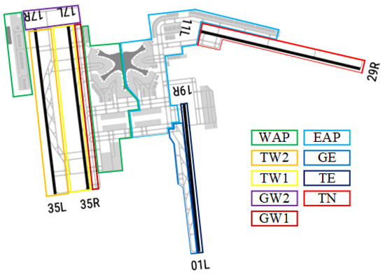 - Chen, Z.; Chong, X.; Liu, C.; Qiao, Y.; Wang, G.; Tan, W. An Airfield Area Layout Efficiency Analysis Method Based on Queuing Network and Machine Learning. Buildings 2024, 14, 628. [Google Scholar] [CrossRef]