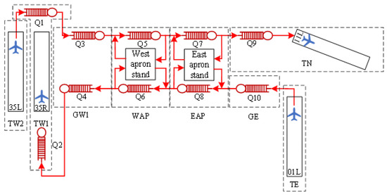 Apron queues serve inbound flights during the parking process from taxiways to parking stands, outbound flights during the pushback process from parking stands to taxiways, and the taxiing process of flights on taxiways. Ground queues are divided into eastbound and westbound queues by taxi direction, corresponding to the waiting process on main taxiways. Tower queues serve outbound flights during the release waiting process from taxiways to runways and inbound flights during the exit waiting process from runways to taxiways.