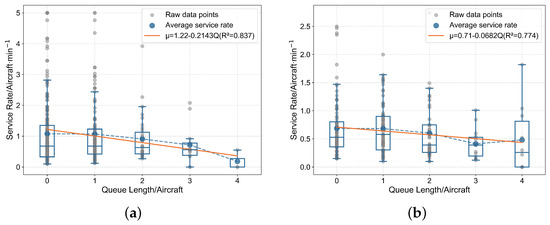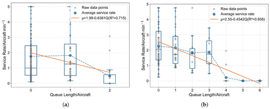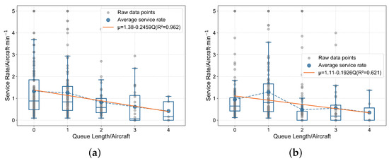 For each five-minute statistical window, we count the total number of aircraft exiting the queue within the window (i.e., the number of aircraft that have completed service). We then divide this total by the duration of the window to obtain the service rate corresponding to that five-minute window, with the unit being aircraft per minute. For example, if 10 aircraft complete service and exit the queue within a five-minute window, the service rate for that window is 2 aircraft per minute.