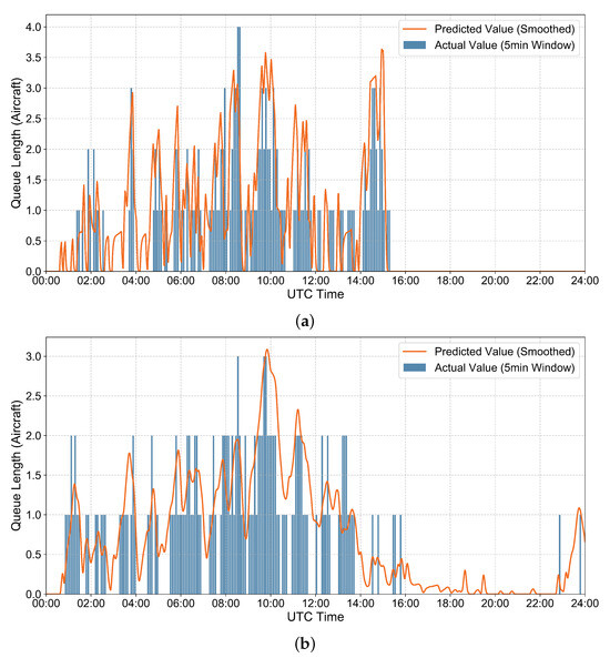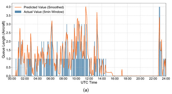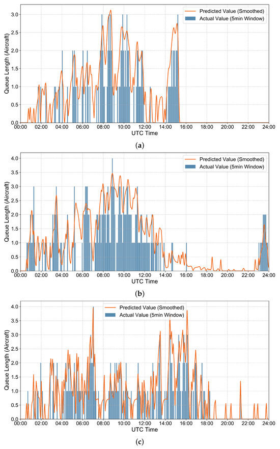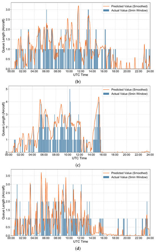 As shown in Figure 11, Figure 12 and Figure 13, the model’s predicted values align closely with the actual values throughout the diurnal tidal fluctuations of the full UTC day. Changes in queue length during both off-peak hours (00:00–08:00 Beijing Time) and peak hours are accurately captured, demonstrating the model’s consistency across all control sectors and time periods. The model thus demonstrates cross-sector and full-time universality.