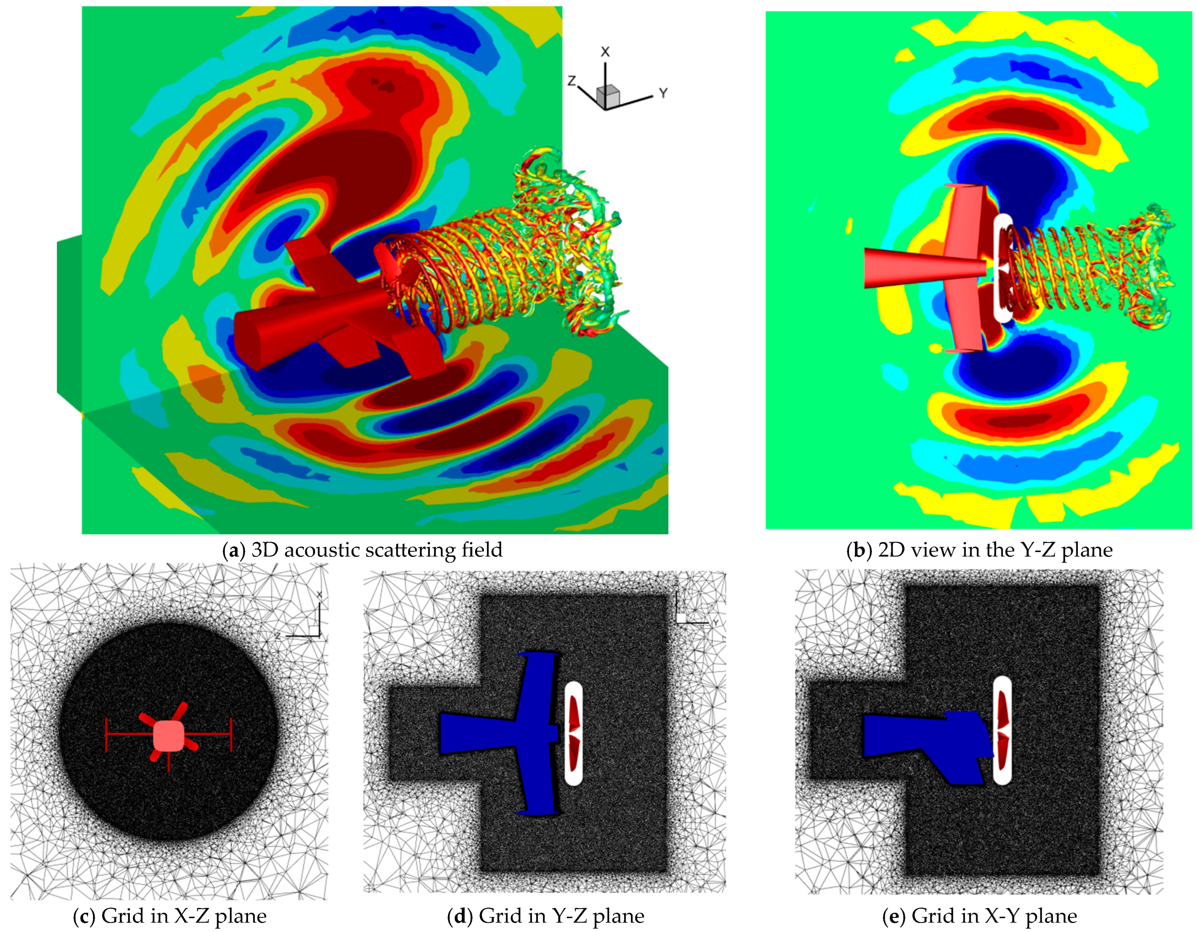 - Yang, T.; Chen, X.; Zhao, Q.; Ding, Y. Numerical analysis on the high-speed impulsive noise propagation characteristic of helicopter rotor in the presence of strong shear flow. Appl. Acoust. 2023, 203, 109213. [Google Scholar] [CrossRef]