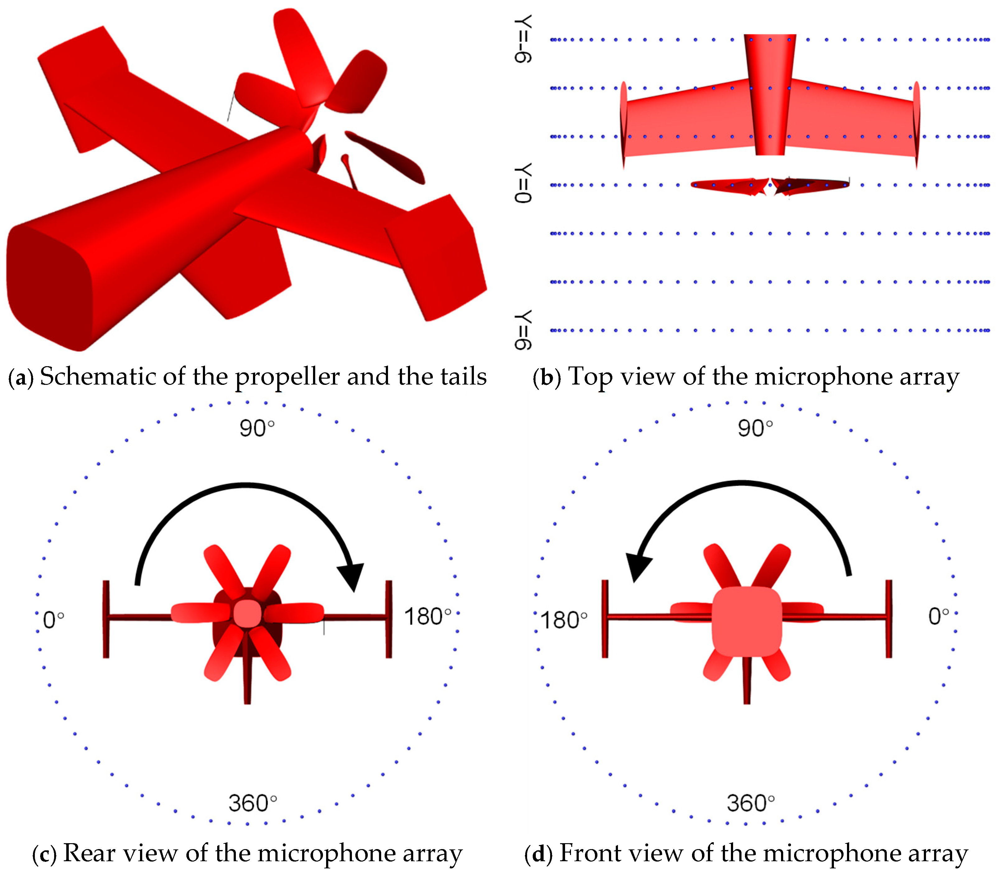 - Soderman, P.T.; Horne, W.C. Acoustic and Aerodynamic Study of a Pusher-Propeller Aircraft Model; NASA Technical Paper 3040; NASA: Washington, DC, USA, 1990.