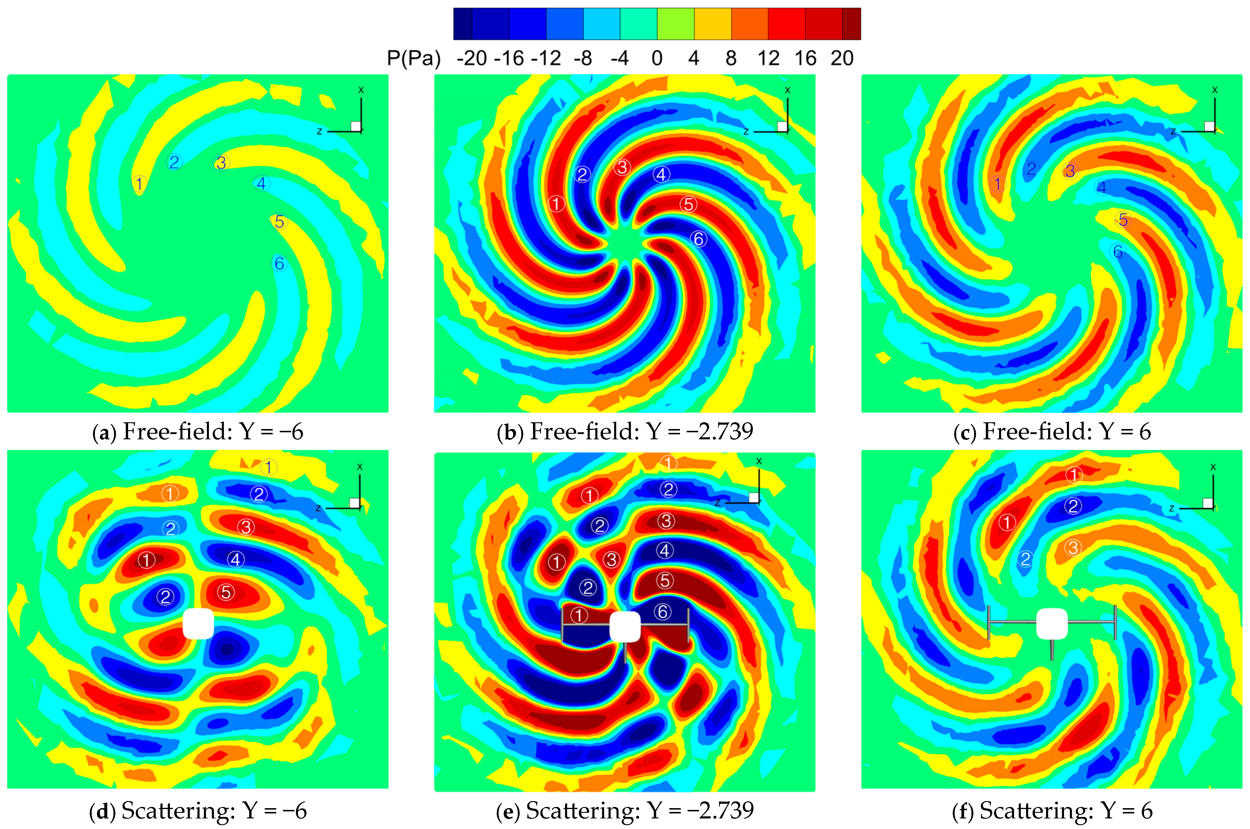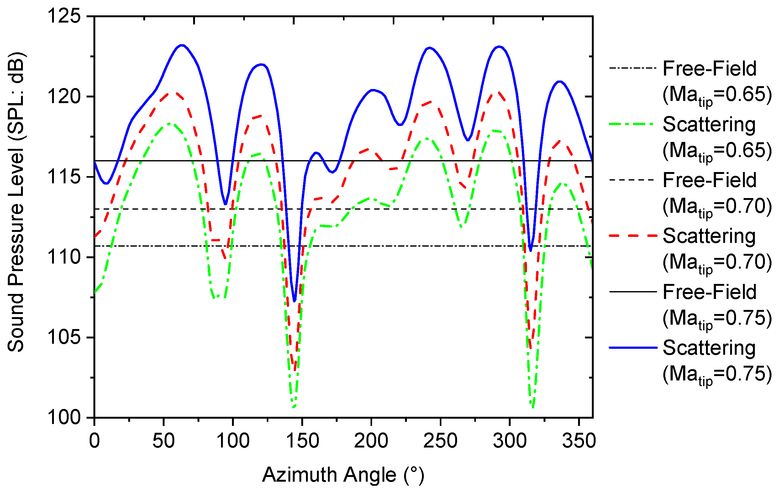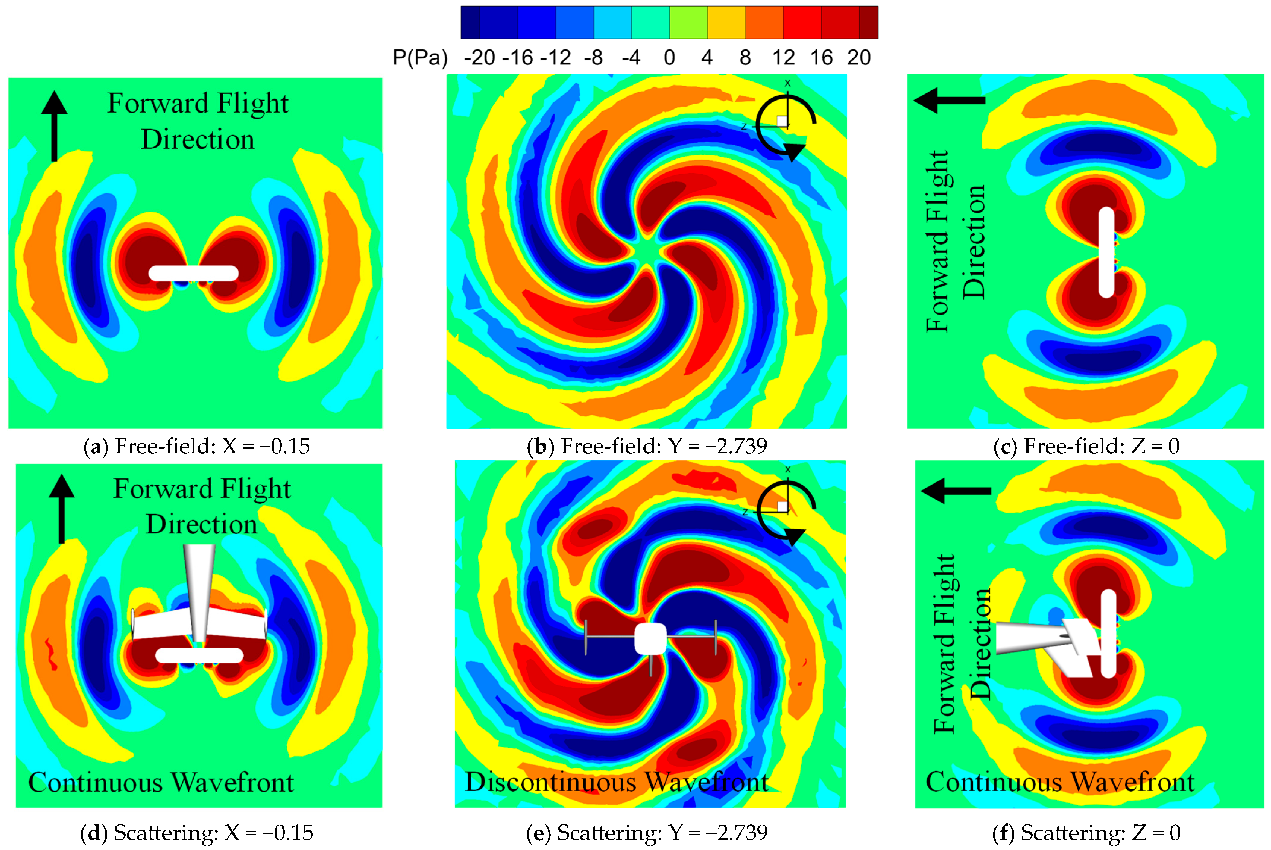 - Strong multiple-reflection effects of the acoustic waves happen when they interact with the vertical/horizontal tails. For the four-blade propeller, the reflected acoustic waves interacted with the subsequently arriving first acoustic wave, leading to the formation of one short acoustic wave with a high intensity. For the six-blade propeller, two short waves are generated. The first short acoustic wave with high intensity is generated when the acoustic wave is reflected by the vertical/horizontal tails, and the second short acoustic wave is then generated due to the mutual interaction between the first short wave and the subsequently arriving first acoustic wave.