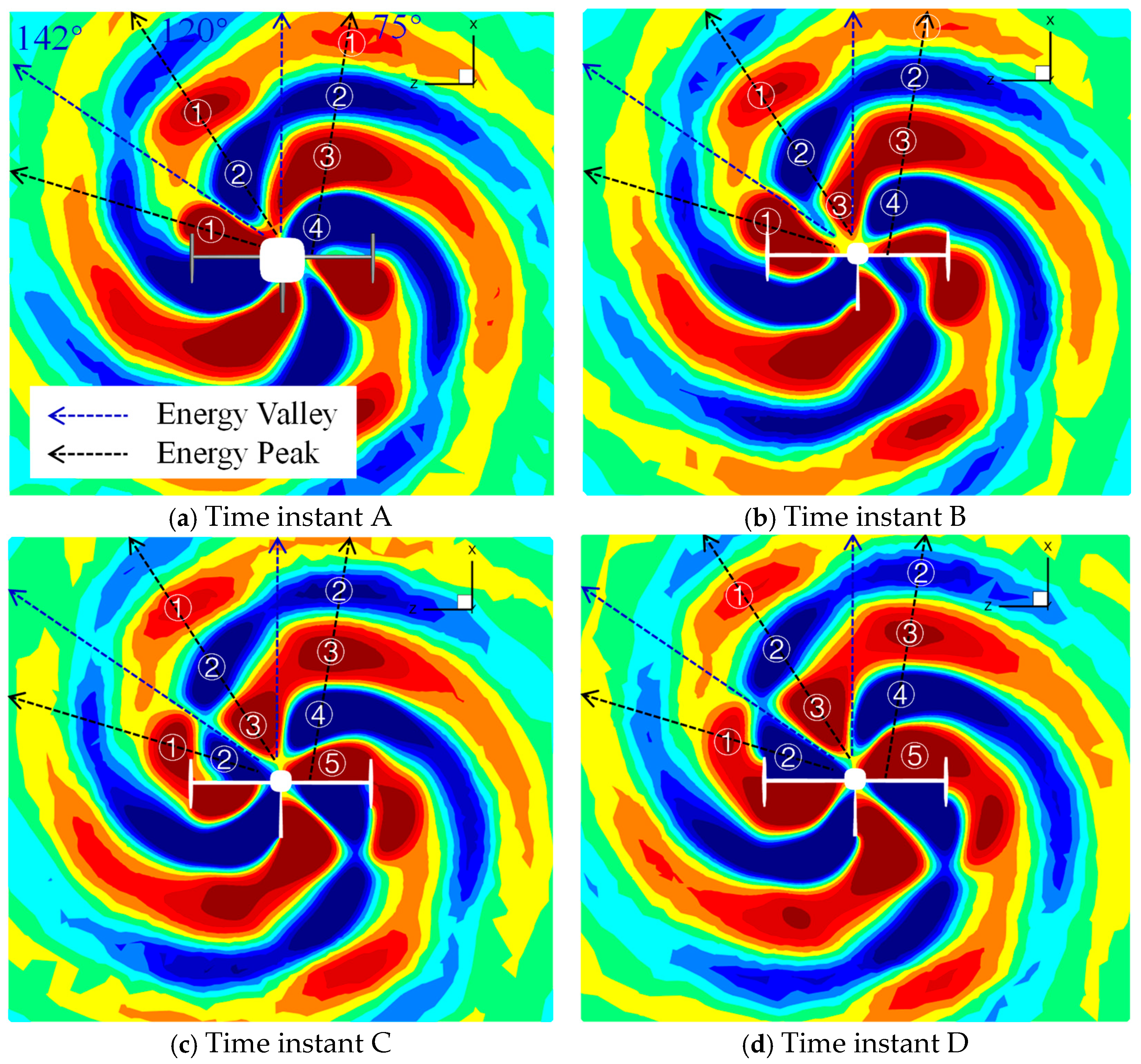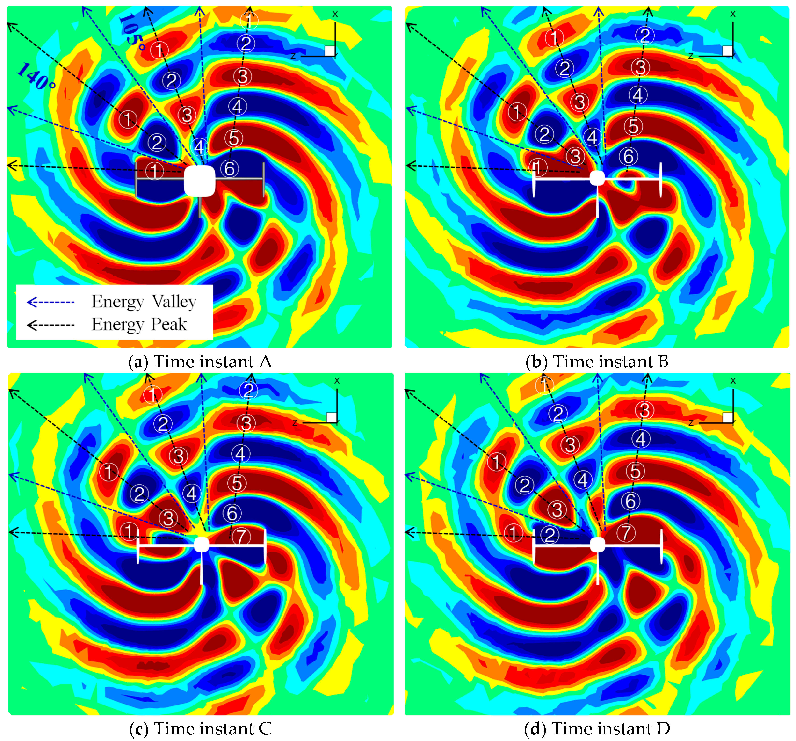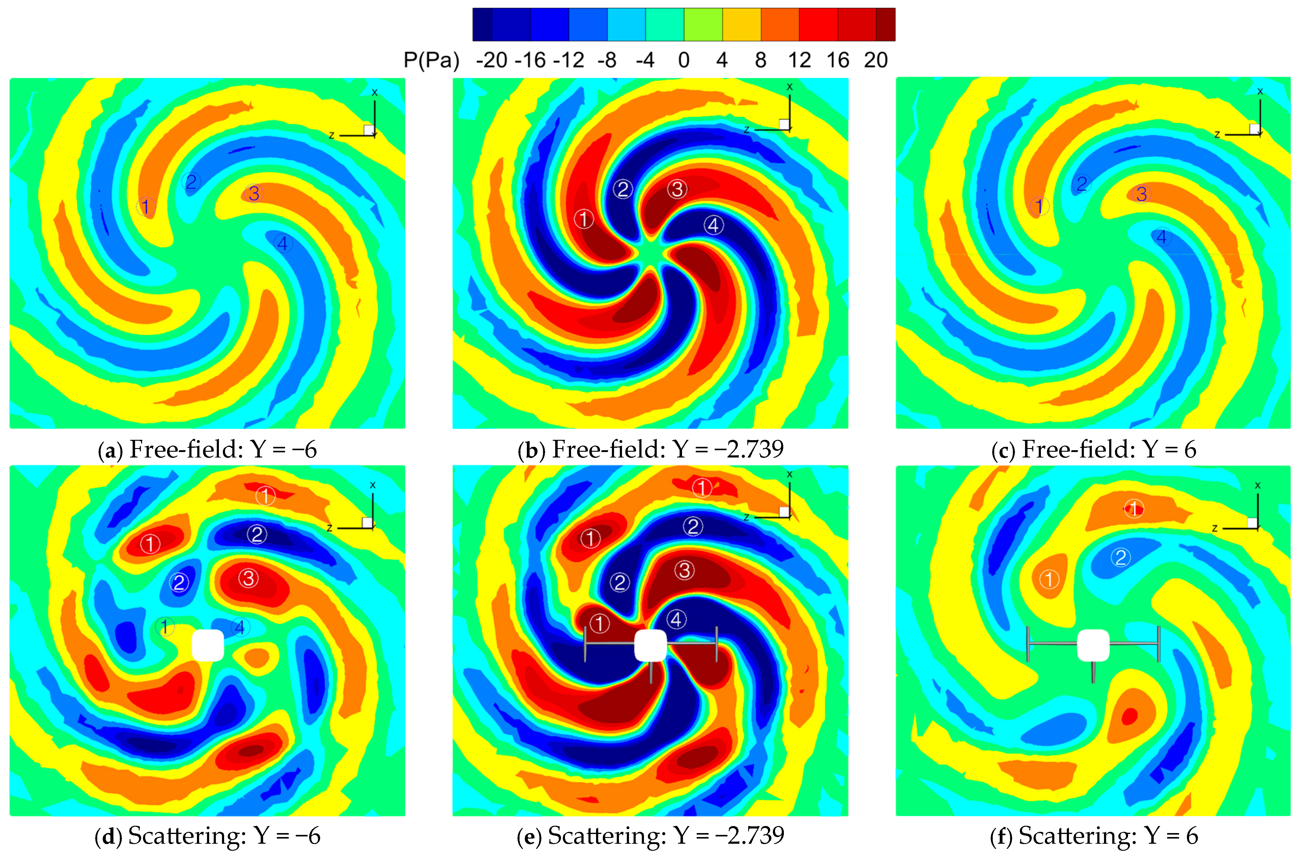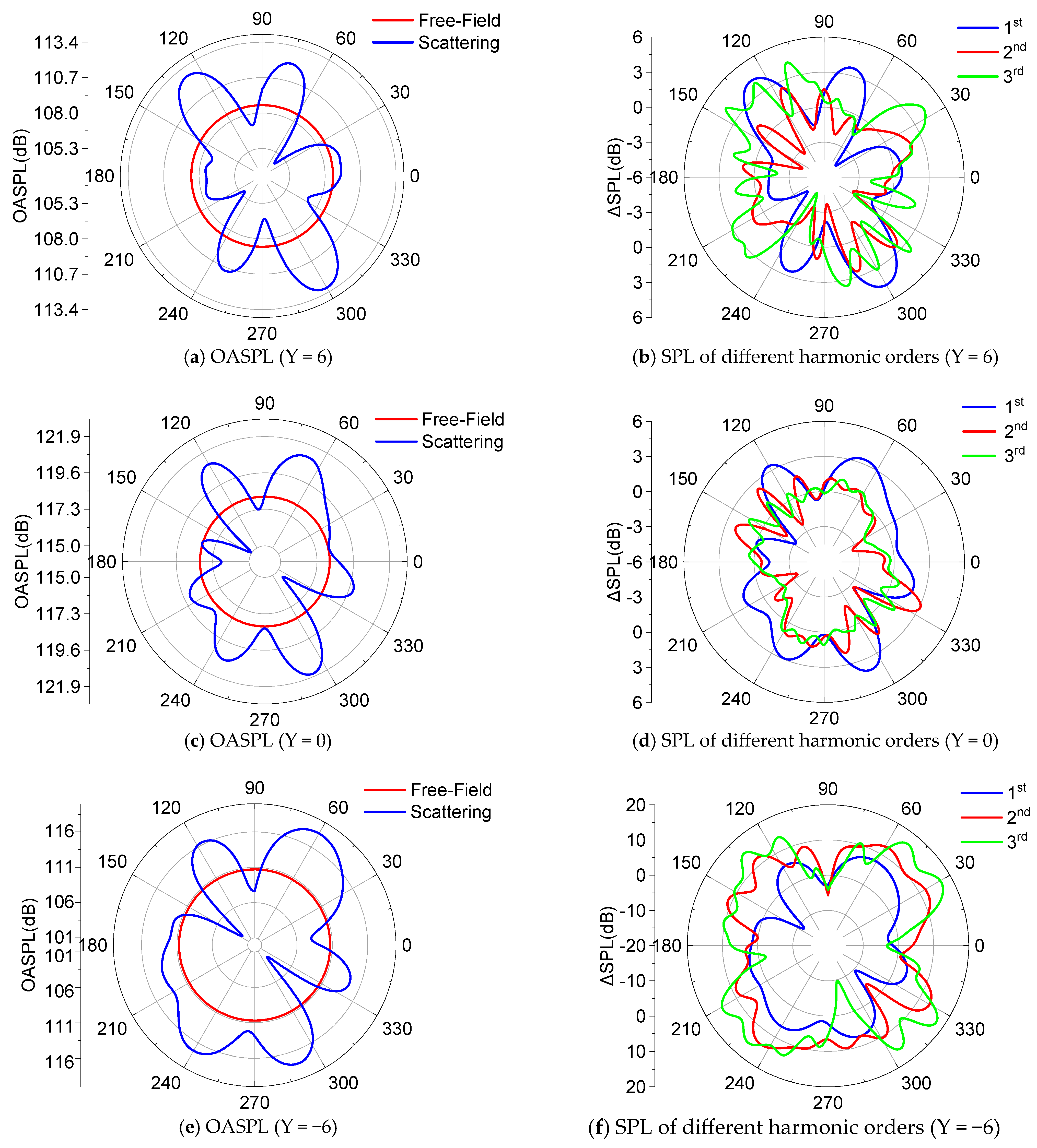 - For the four-blade propeller, due to the mutual interaction between the acoustic waves, the reflected acoustic waves are compressed by the subsequently arriving first acoustic waves, leading to the diffraction of the reflected acoustic waves at the tip of the vertical tail. For the six-blade propeller, most of the acoustic energy is reflected, so the energy of the diffraction acoustic waves occupies only a small portion when compared with the four-blade propeller. The interaction pattern of the tails on the propeller acoustic is highly correlated with the harmonic orders, and the effect of the vertical/horizontal tails on the propeller noise is dominated by the alteration of the first-order harmonic noise.