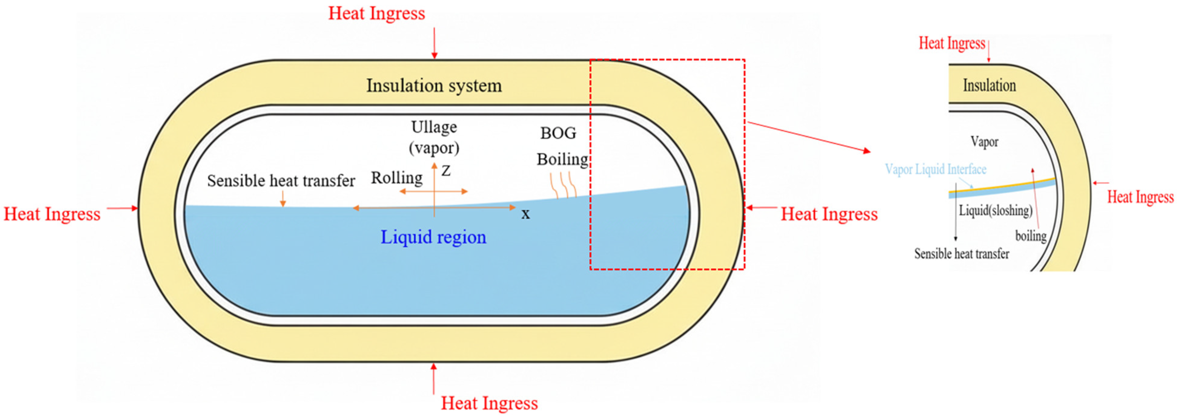 - Jeon, G.-M.; Jeong, S.-M.; Park, J.-C. Experimental and numerical investigation of the influences of sloshing motion on the change in boil-off gas/boil-off rate in a cryogenic liquid tank. Ocean Eng. 2024, 298, 117173. [Google Scholar] [CrossRef]
