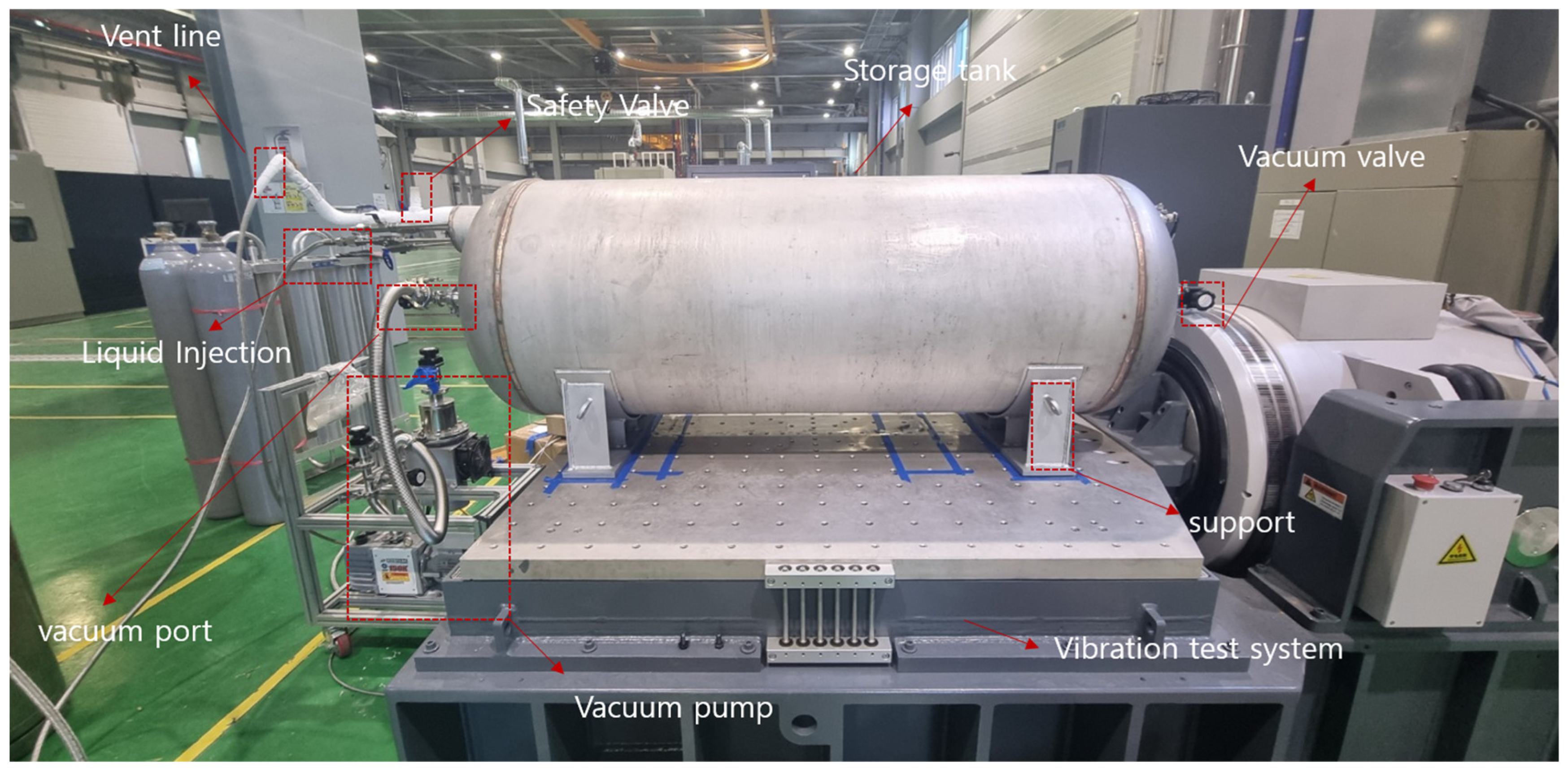 - Jeon, G.-M.; Park, J.-C.; Kim, J.-W.; Lee, Y.-B.; Kim, D.-S.; Kang, D.-E.; Lee, S.-B.; Lee, S.-W.; Ryu, M.-C. Experimental and numerical investigation of change in boil-off gas and thermodynamic characteristics according to filling ratio in a C-type cryogenic liquid fuel tank. Energy 2022, 255, 124530. [Google Scholar] [CrossRef]