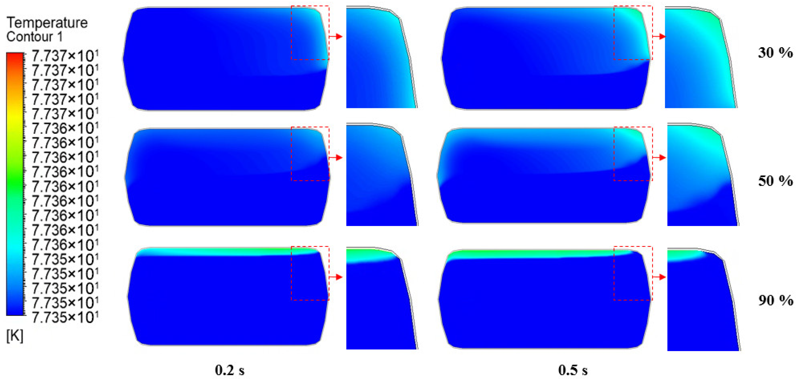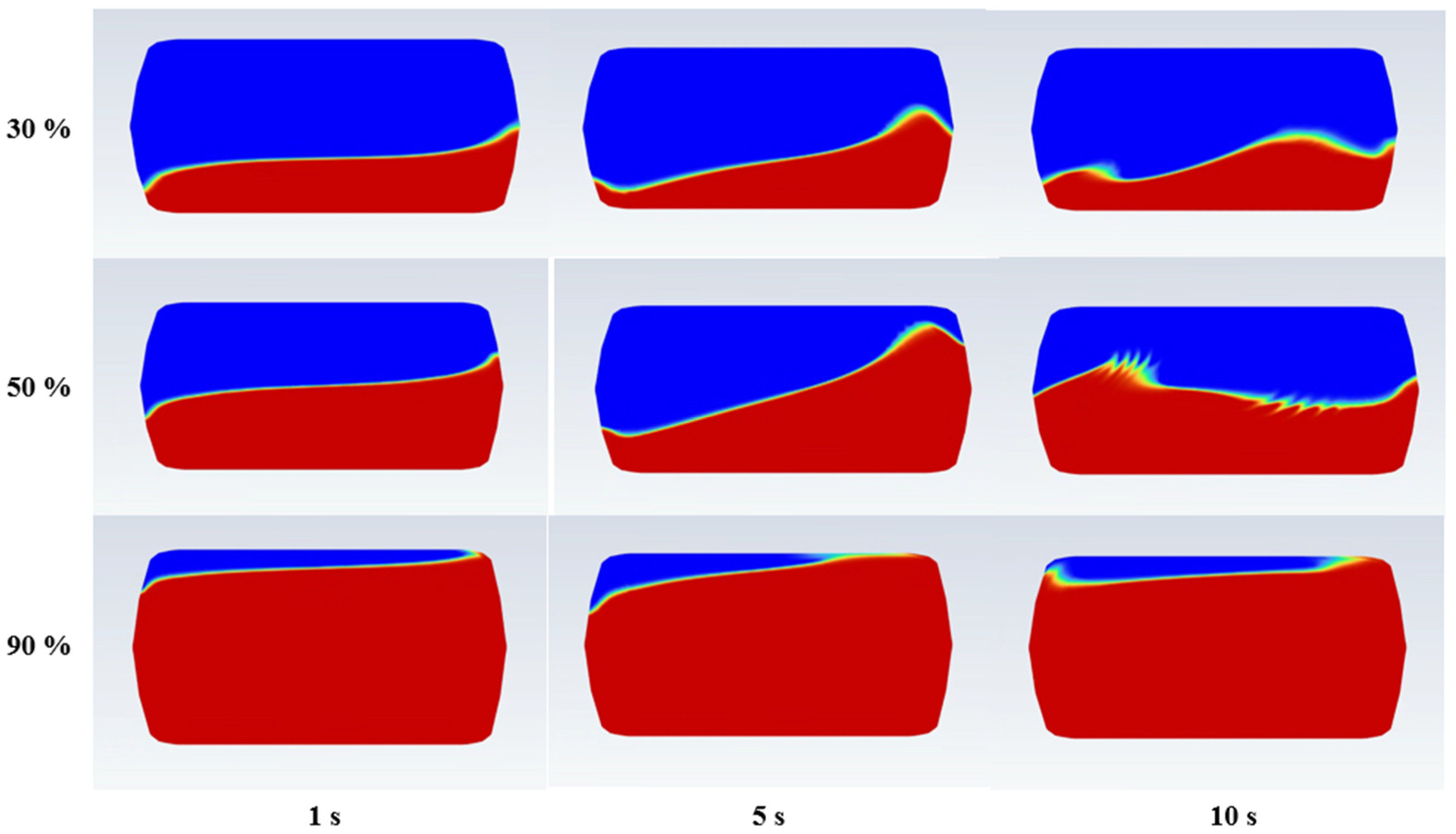 - The development of thermal stratification is strongly dependent on excitation frequency. At 5 Hz, temperature gradients develop uniformly throughout the liquid domain and gradually intensify over time. At 10 Hz, thermal generation is significantly suppressed at 30% and 50% fill ratios, whereas at a 90% fill ratio, sharp and localized temperature gradients form near the tank wall due to geometric confinement and limited convective mixing.