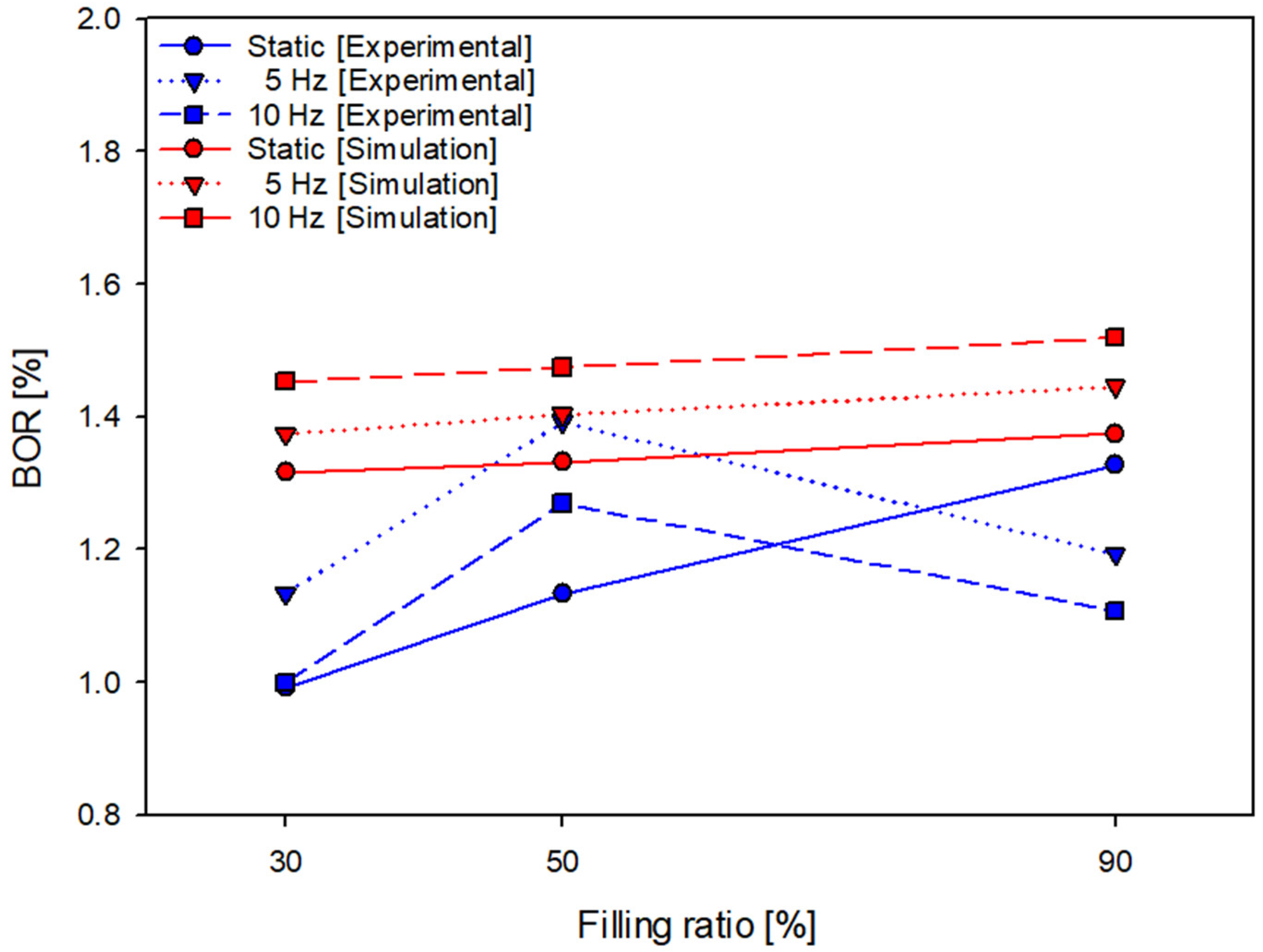 - Sloshing behavior exhibits a strong frequency dependence, significantly influencing heat transfer and BOG generation. At 5 Hz, dynamic sloshing motion promotes distributed thermal stratification, resulting in a higher BOR (1.4%/day at a 50% fill ratio). In contrast, at 10 Hz, increased viscous damping suppresses sloshing amplitude, leading to localized wall heating and a reduced overall BOR (1.3%/day at a 50% fill ratio).