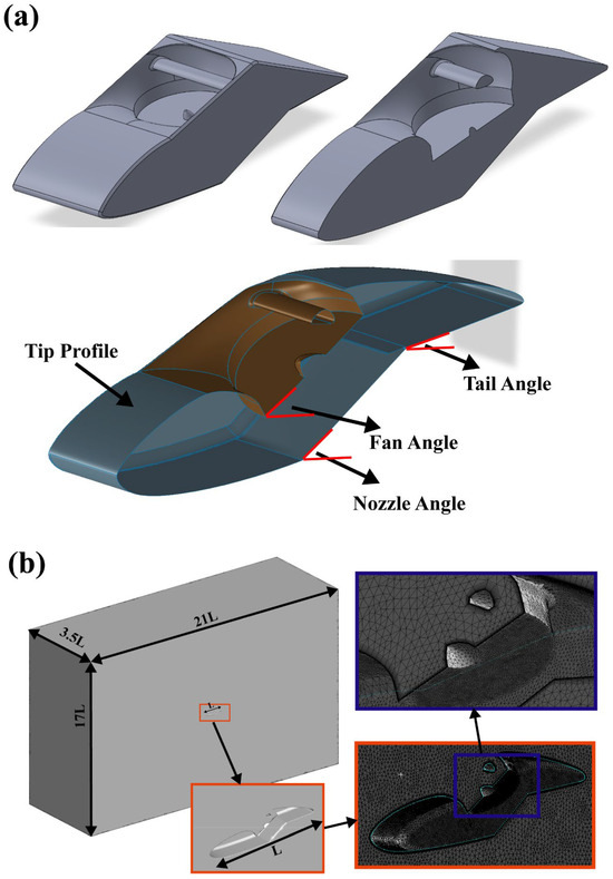 and ), and critical aerodynamic performance metrics. (a) Horizontal velocity, (b) Fan angle, (c) Nozzle angle, (d) Tail angle, and (e) Tip profile.