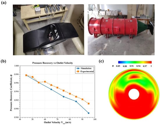 The experimental data presented in this section were obtained from wind tunnel tests performed by our research group on a 1:1.05 scale VTOL nacelle model (fan diameter ), as shown in Figure 3a. Eight total-pressure probes were mounted circumferentially at the intake exit plane to measure the total-pressure recovery coefficient (σ), defined as the ratio of outlet total pressure to freestream total pressure, and static-pressure taps were embedded along the inner cowl wall for detailed pressure recovery measurements. All pressure signals were acquired using a multichannel pressure scanner with a full-scale accuracy of ±0.05% and sampled at 10 Hz. This high-accuracy instrumentation, combined with individual probe calibration and standard wind-tunnel blockage corrections, ensures the reliability of the experimental pressure data used for validation. Ambient static pressure and temperature were monitored continuously with a manometer and platinum-wire thermometer, respectively. The wind tunnel test section dimensions are , and the blockage ratio was calculated to be less than 5%. A single series of wind-tunnel tests was carried out to examine nacelle performance under cruise-condition aerodynamics. The model was tested at a free-stream speed of (, turbulence intensity ). Pressure data from each probe was corrected using its individual calibration curve, and a standard wind-tunnel wall blockage correction was applied. All tests were conducted at zero angle of attack (AoA = 0°), defined as the angle between the freestream velocity vector and the nacelle centerline. The deflector angle was swept from to to assess its effect on total-pressure recovery. Total-pressure measurements were recorded at each angle, and external flow was visualized using the oil-flow technique. No separate VTOL-mode entrainment tests were performed; all validation data refer to the cruise-condition wind-tunnel campaign.