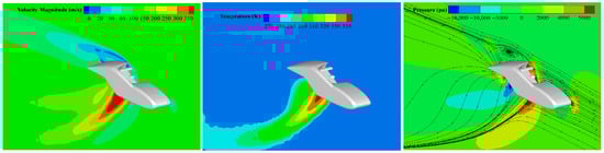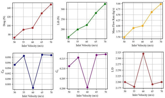 where and are the free-stream density and velocity, respectively, and is the aircraft’s reference area. In sum, the combination of a high-fidelity geometric model (developed in SolidWorks) and an advanced turbulence model () in Ansys Fluent provides a robust framework for predicting the aerodynamic performance of the gas-driven fan VTOL configuration. By systematically varying parameters such as fan pressure ratio, inlet geometry, and nozzle deflection angle, the present methodology enables an in-depth exploration of aerodynamic trade-offs central to VTOL aircraft design.