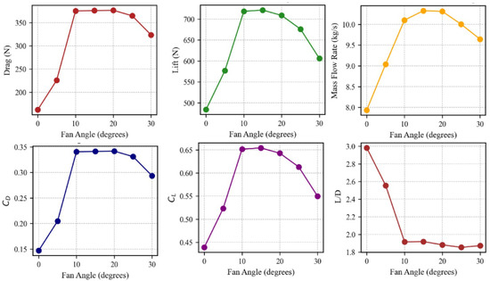 - Near-zero fan angle () gives the maximum possible lift-to-drag ratio (up to 2.98 within our database) for cruise-like conditions.