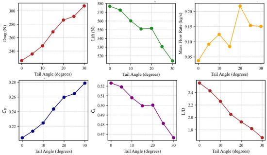 Through our multi-parameter analysis, we confirmed the strong dependence between key design parameters (horizontal speed, fan angle, nozzle angle, tail angle, and tip shape). For instance, tilting the fan axis or nozzle to improve vertical lift can generate significant drag during forward flight, but adjusting the tail angle or optimizing the tip shape can counter some of these penalties. We specifically discovered the following: