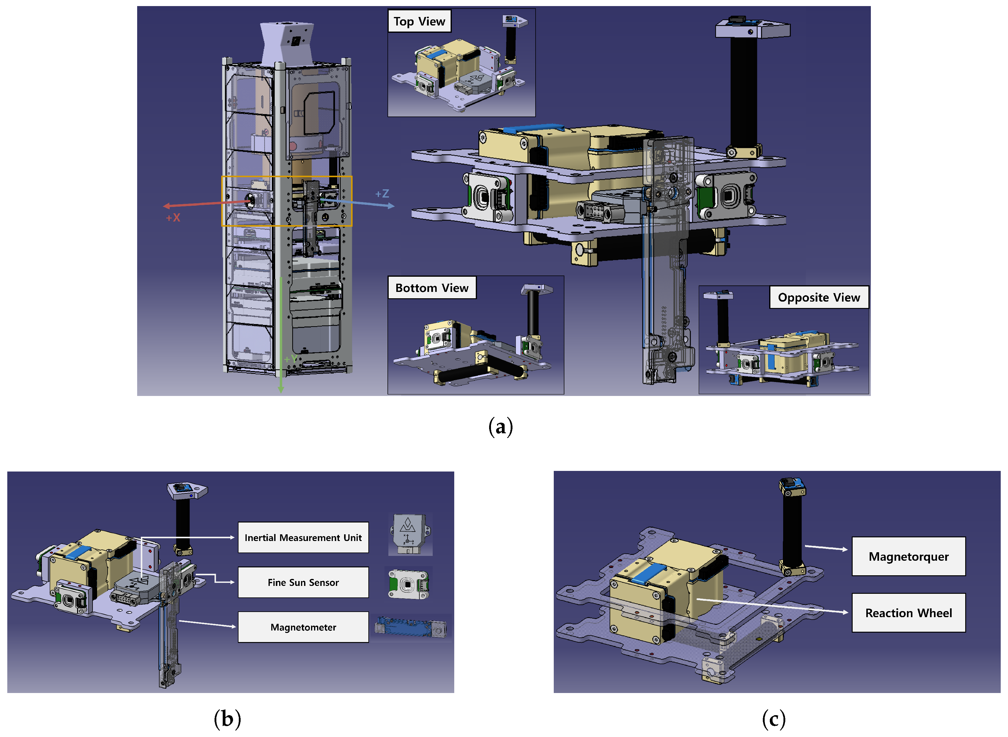 Figure 1, (a) presents the overall view of the 3U CubeSat structure, illustrating the ADCS assembly from various views and the body coordinate frame. The sensor placement is configured as shown in (b). The attitude determination system includes five fine Sun sensors. Four sensors are mounted on the side panels spaced 90 degrees apart, while the fifth sensor is mounted on the body -Y face. The actuator configuration is depicted in (c), which shows magnetic torquers aligned with the X, Y, and Z axes and reaction wheels mounted along the X and Y axes.
