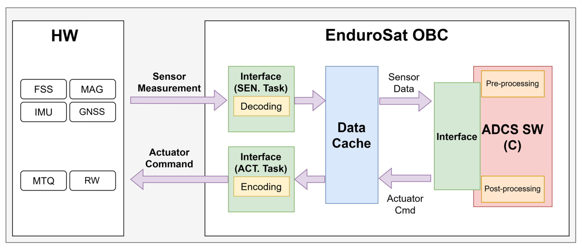 Figure 5. Each sensor acquisition task reads measurements from the corresponding device interface and stores them in a shared DataCache for use by other flight-software modules. The ADCS task reads the required input data (e.g., sensor measurements, spacecraft mode information, and predefined event flags) from the DataCache, executes the ADCS algorithms, and writes the computed actuator command outputs to the DataCache. Actuator tasks then read the stored commands and apply them to the corresponding hardware devices. This architecture maintains a coherent data flow within the FSW, from sensor acquisition through ADCS computation to the actuators. Moreover, by maintaining a consistent interface, the ADCS software can be reused for both PIL testing and sensor-to-actuator verification. This requires modifying only the sensor and actuator communication layers, thereby ensuring a continuous and consistent verification workflow throughout development.