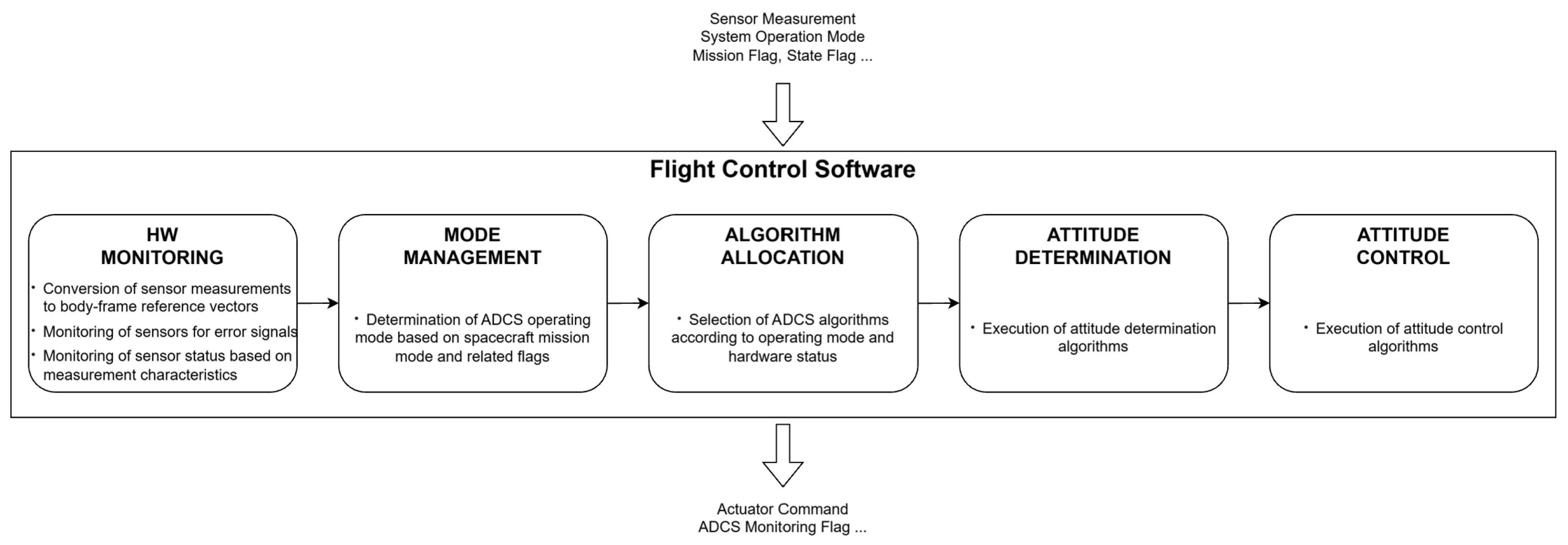The commercial onboard computer used in the INHA RoSAT mission does not provide an interface for integrating user-defined ADCS modules. Consequently, ADCS algorithms must be implemented in C as custom modules and integrated into the existing FSW framework. In addition, an interface was required in order to exchange state information between the ADCS software and the core flight-software services (e.g., command handling, scheduling, and data management). The overall ADCS software architecture is illustrated in
