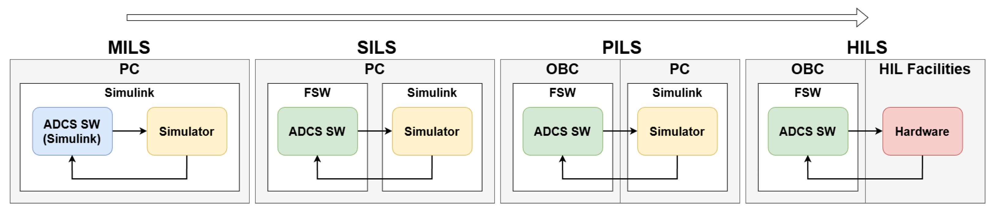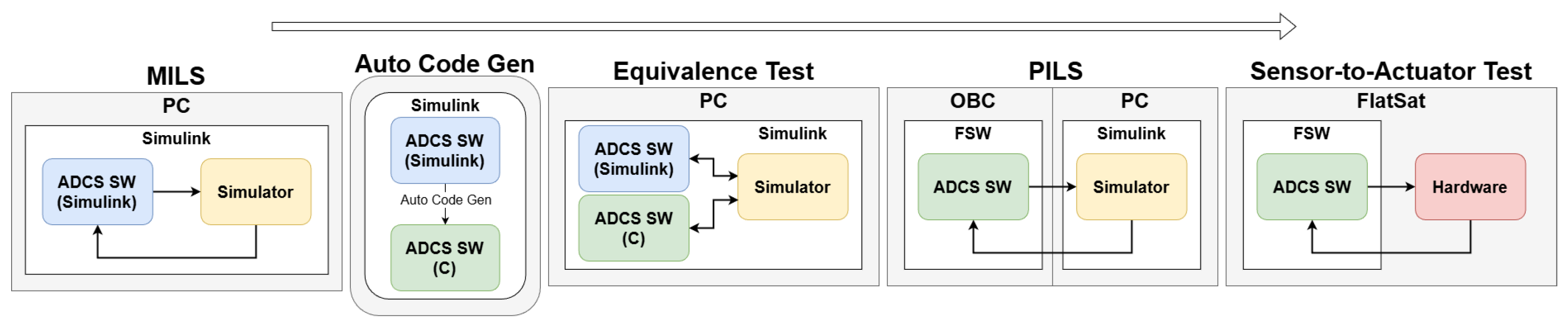 Figure 7, the standard verification process consists of model-in-the-loop (MIL), software-in-the-loop (SIL), processor-in-the-loop (PIL), and hardware-in-the-loop (HIL) simulations. First, at the MIL step, the functional validity of the ADCS algorithms implemented in Simulink and their stability under representative operational scenarios are verified. The next step is SIL testing. In this phase, the converted C code is validated to ensure functional equivalence with the ADCS software from the MIL phase and to verify its integration with the FSW. Subsequently, PIL testing is conducted by loading the code onto the target processor (OBC). This step focuses on validating the execution of the algorithms within the actual hardware environment and ensuring real-time performance. Finally, HIL testing validates the software integrated with actual hardware components in a loop to verify system-level performance.