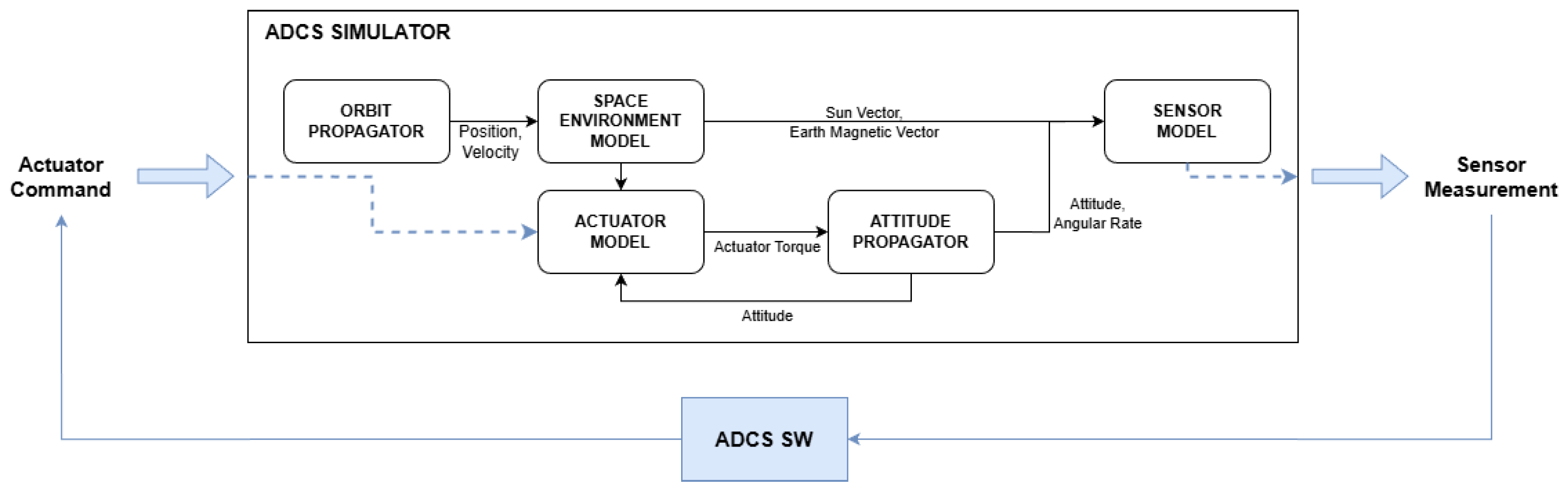 Figure 8, the simulator consists of an orbit propagator, space environment models, and attitude dynamics models. It propagates the satellite’s orbit and attitude states to generate simulated sensor measurements and reflects the attitude dynamics based on the torque commands received from the actuator models. This simulator architecture is utilized consistently across the MIL, SIL, and PIL stages to ensure coherent verification results.