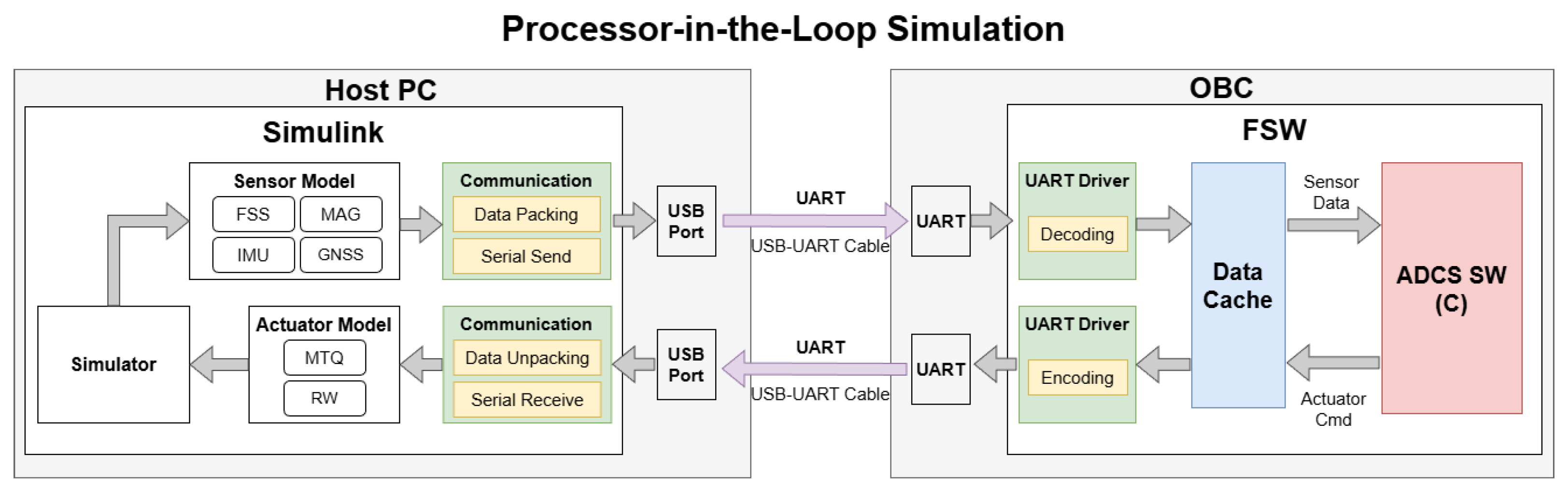 Meanwhile, several studies have addressed the development of PIL and hardware-in-the-loop (HIL) environments for CubeSat verification. A PIL simulation framework was presented in [