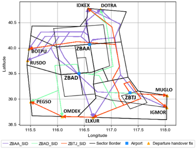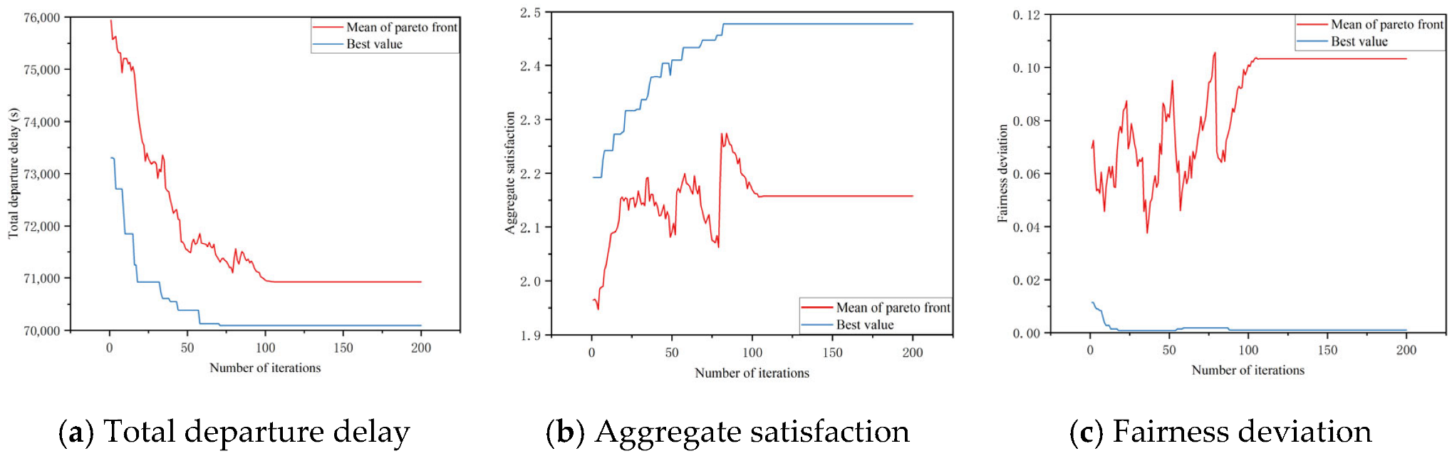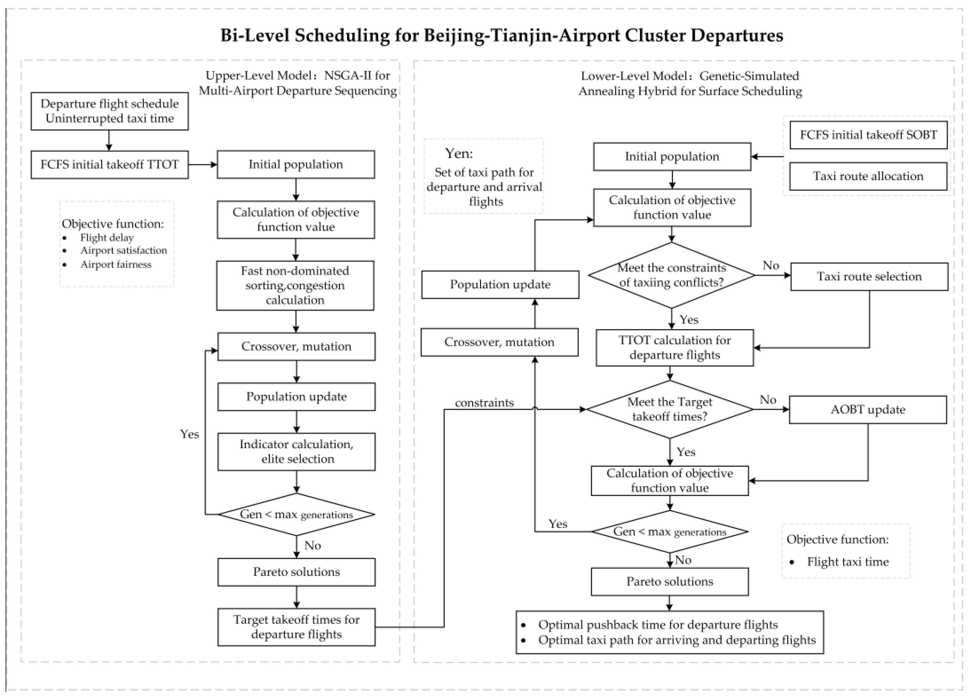 - Upper-Level Optimization: NSGA-II (Non-dominated Sorting Genetic Algorithm II) solves the multi-objective problem to determine optimal target takeoff times () for all departures across the three airports.