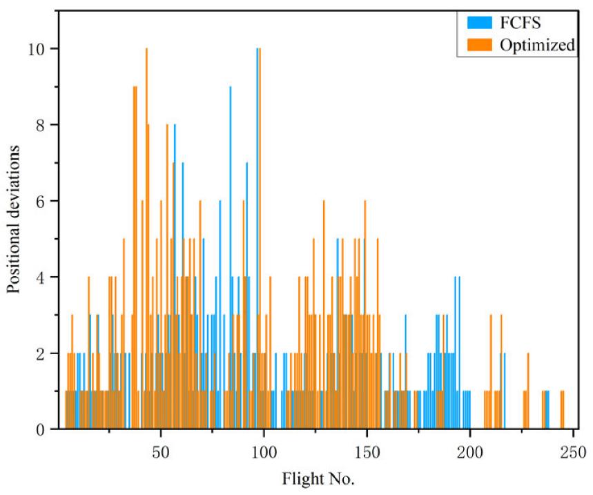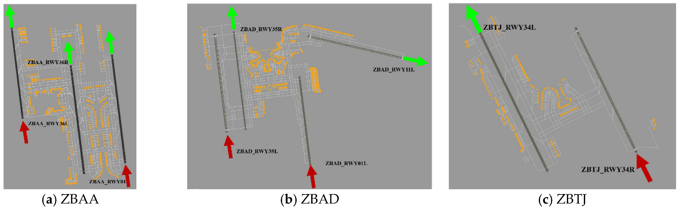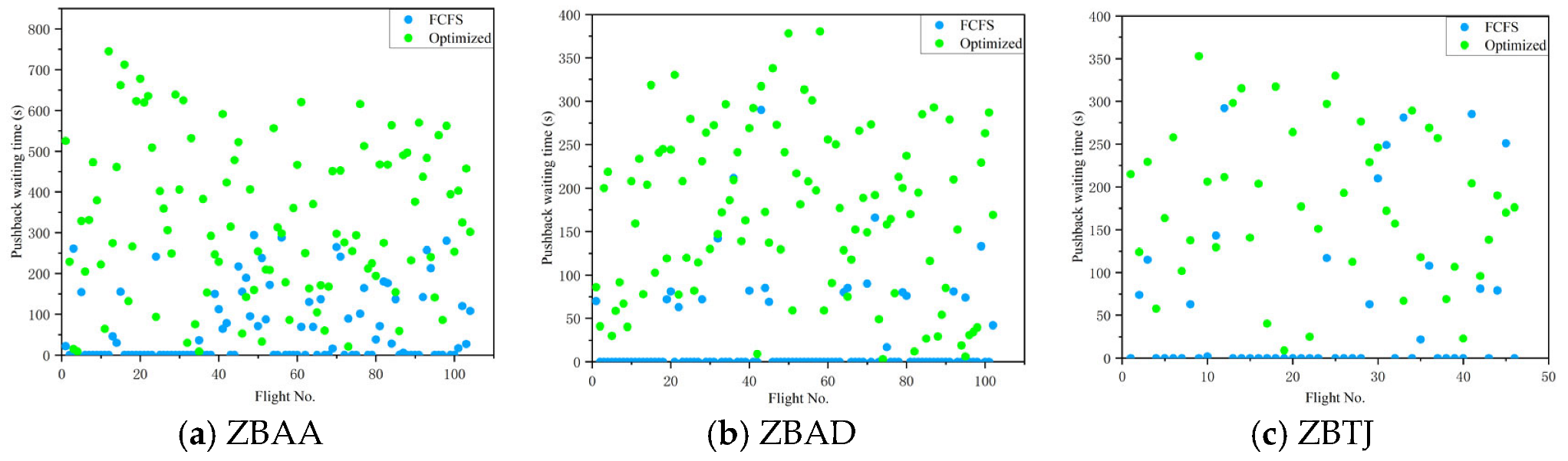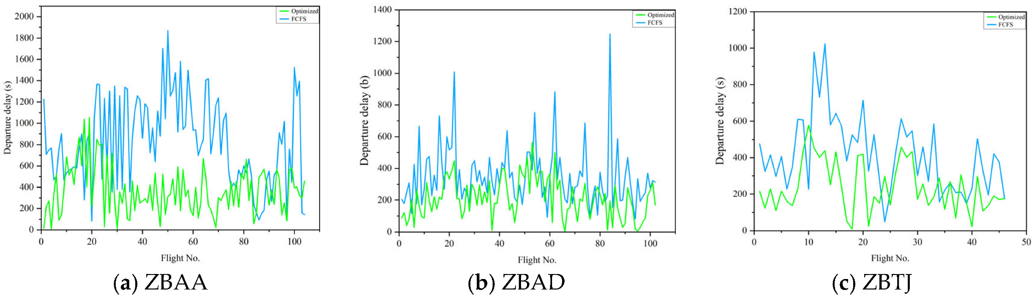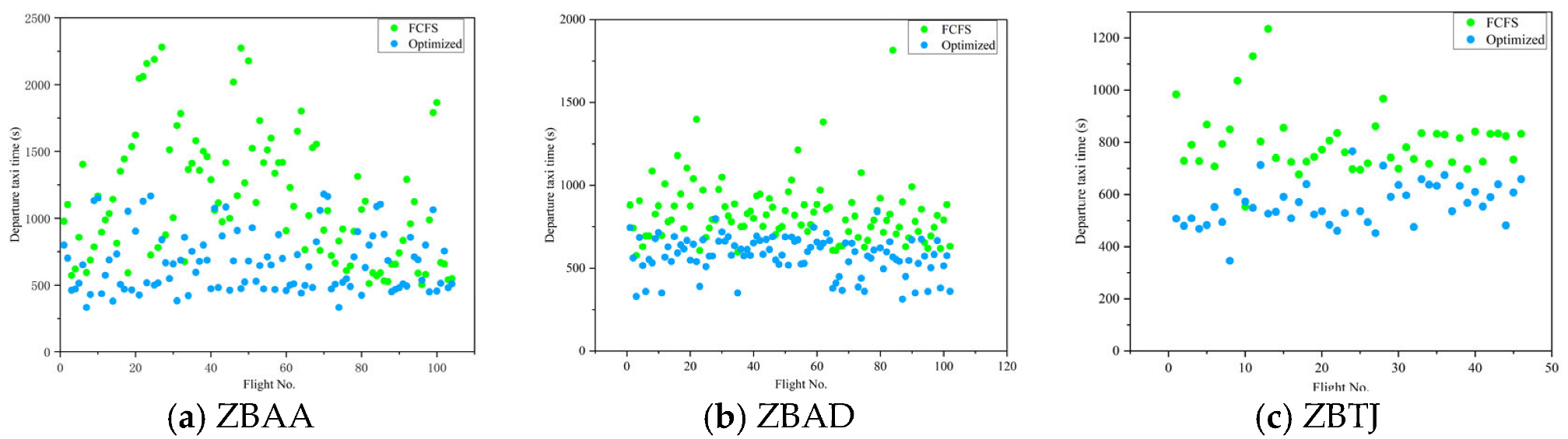 - For ZBAA, = 0.98 and = 0.02, resulting in an optimized runway holding time of 2259 s and total taxi time of 113,728 s;