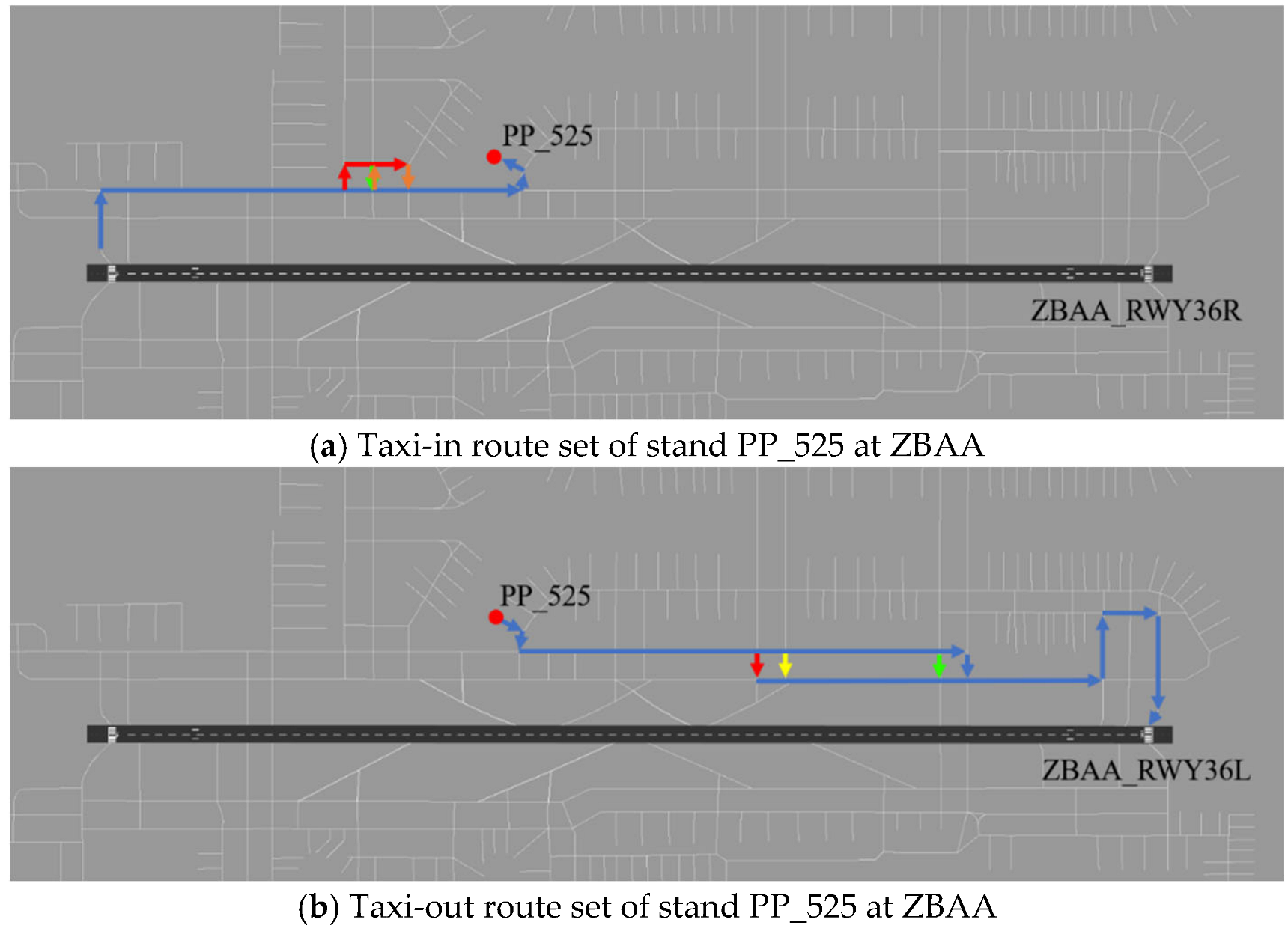- Taxi movements are constrained by airport topology. For each flight, a small candidate set of feasible departure (gate–runway) or arrival (runway–gate) routes is generated via a k-shortest-path method and used as the decision space in the lower-level model.