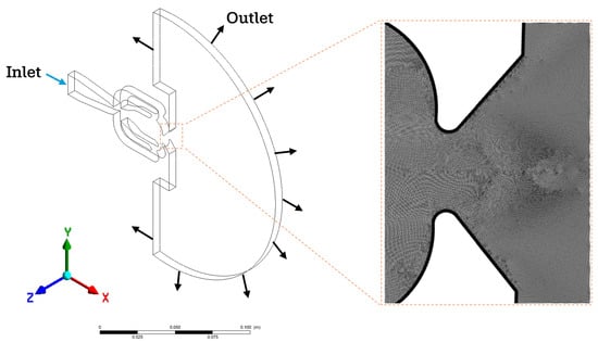 The SJA geometry follows a well-established configuration with a nozzle throat height of mm, consistent with previous numerical and experimental investigations [13,34]. The computational domain extends sufficiently downstream of the actuator exit to capture the oscillating jet in a quiescent environment, as illustrated in Figure 1. A structured–unstructured hybrid mesh is employed, with local refinement in the throat and exit regions to resolve shear layers and switching dynamics.