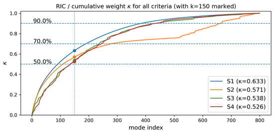 Cumulative modal weight (RIC) as a function of sorted mode index for the four selection criteria (S1–S4) for the baseline case ( lb/s). The vertical dotted line marks . The colored circles indicate the value of at for each criterion. Horizontal dashed lines indicate representative thresholds (50%, 70%, and 90%).