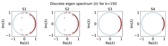 The dominant ES-DMD (S4) modes and their time dynamics shown in Figure 6 and Figure 7, respectively, further confirm the physical relevance of the extracted structures. The leading mode captures the mean jet profile, while higher-order modes correspond to coherent oscillatory components responsible for jet sweeping. The imaginary parts of the associated eigenvalues encode oscillation frequencies, while the real parts represent growth or decay rates. Near-zero real parts, therefore, indicate sustained dynamics.