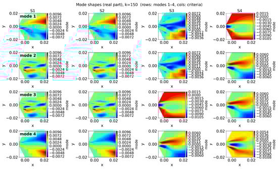 First four DMD mode shapes (real part) for each criterion (rows: modes 1–4, columns: S1–S4) for the baseline case with . The leading mode represents the mean-like structure, while higher-order modes encode oscillatory switching features.