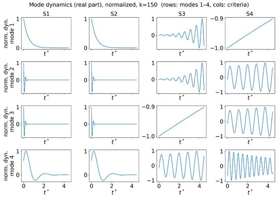 Normalized time dynamics (real part) of the first four retained modes for each criterion (rows: modes 1–4, columns: S1–S4) for the baseline case with . ES-DMD (S4) retains temporally persistent oscillatory dynamics associated with switching.